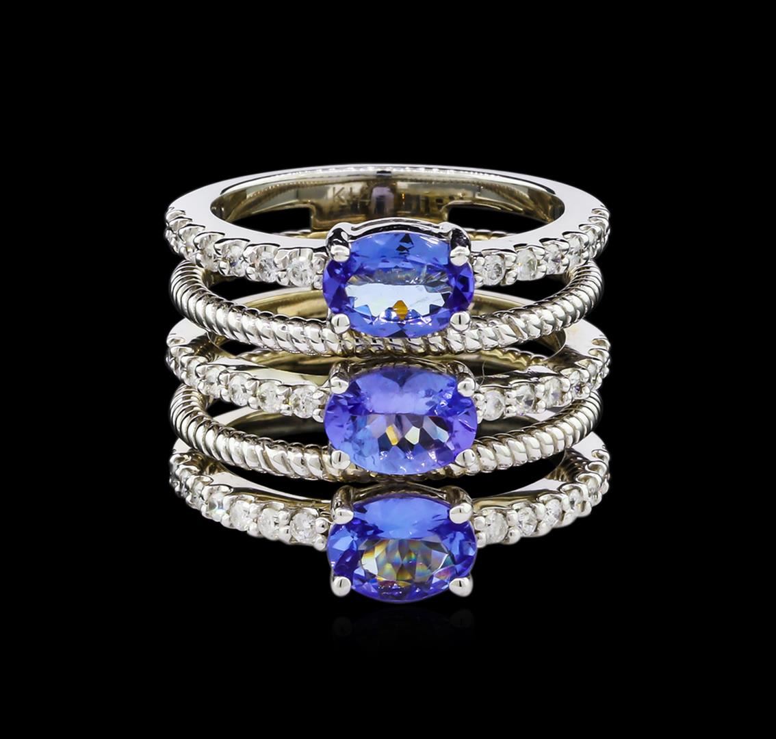 One electronically tested 14KT white gold lady's combination cast & assembled fashion ring with a five row split shank with a bright polish finish. The featured lady's ring has a shank measuring 13.28 millimeters wide. Identified with markings of "K14". Condition is new, good workmanship. Containing: Three prong set oval modified brilliant cut natural tanzanite's, measuring 7.15 x 5.21 x 3.04mm, approximate total weight of 2.43ct., clarity is slightly included, type I, medium light, very slightly grayish, bluish violet color, (GIA bV 4/3), cut is good. Transmitting light with a minimum of distortion, transparent. Colored gemstones are presumed to have been subjected to commonly used enhancement processes. Graded in the setting. Forty-Two prong set round brilliant cut diamonds, measuring 1.50 - 1.45 x 0.93mm (depth est.) approximate total weight of 42 Stones = 0.55ct. Graded in the setting. Clarity: SI-1 to I-1. Color: H - I. Cut Good. Total Weight of Colored Stones 2.43ct. Total Weight of Diamonds 0.55ct. Total Weight of Ring 11.40gm. GAS Appraised at $4,190.00.