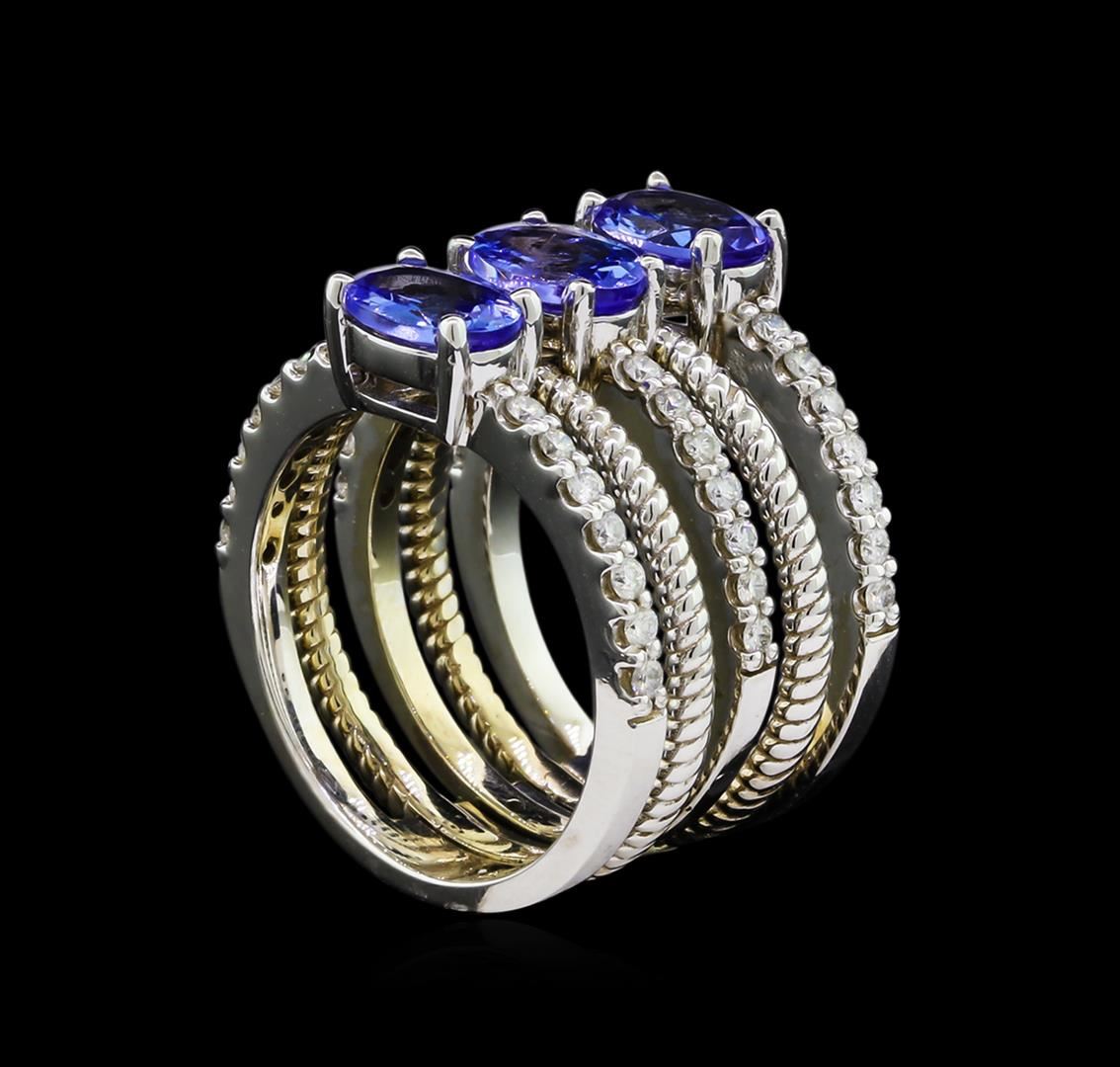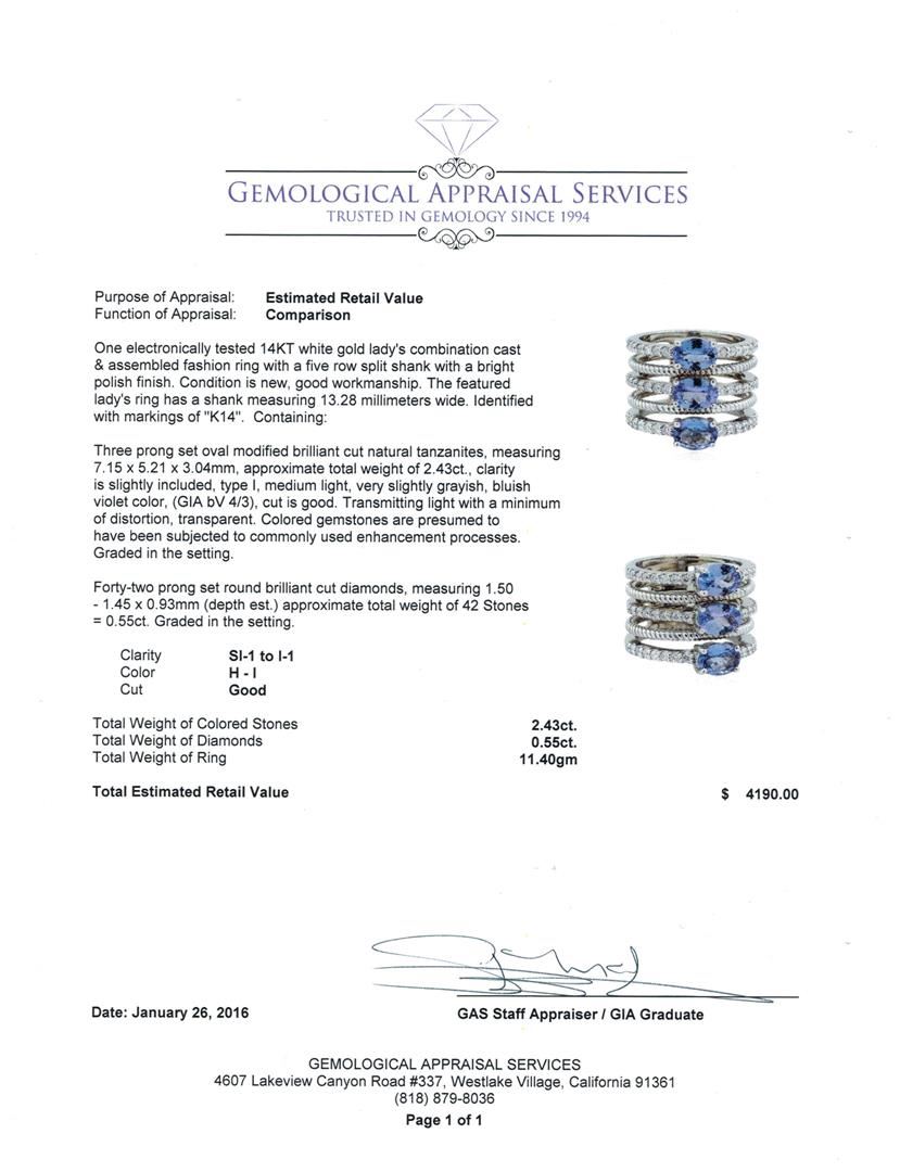 One electronically tested 14KT white gold lady's combination cast & assembled fashion ring with a five row split shank with a bright polish finish. The featured lady's ring has a shank measuring 13.28 millimeters wide. Identified with markings of "K14". Condition is new, good workmanship. Containing: Three prong set oval modified brilliant cut natural tanzanite's, measuring 7.15 x 5.21 x 3.04mm, approximate total weight of 2.43ct., clarity is slightly included, type I, medium light, very slightly grayish, bluish violet color, (GIA bV 4/3), cut is good. Transmitting light with a minimum of distortion, transparent. Colored gemstones are presumed to have been subjected to commonly used enhancement processes. Graded in the setting. Forty-Two prong set round brilliant cut diamonds, measuring 1.50 - 1.45 x 0.93mm (depth est.) approximate total weight of 42 Stones = 0.55ct. Graded in the setting. Clarity: SI-1 to I-1. Color: H - I. Cut Good. Total Weight of Colored Stones 2.43ct. Total Weight of Diamonds 0.55ct. Total Weight of Ring 11.40gm. GAS Appraised at $4,190.00.