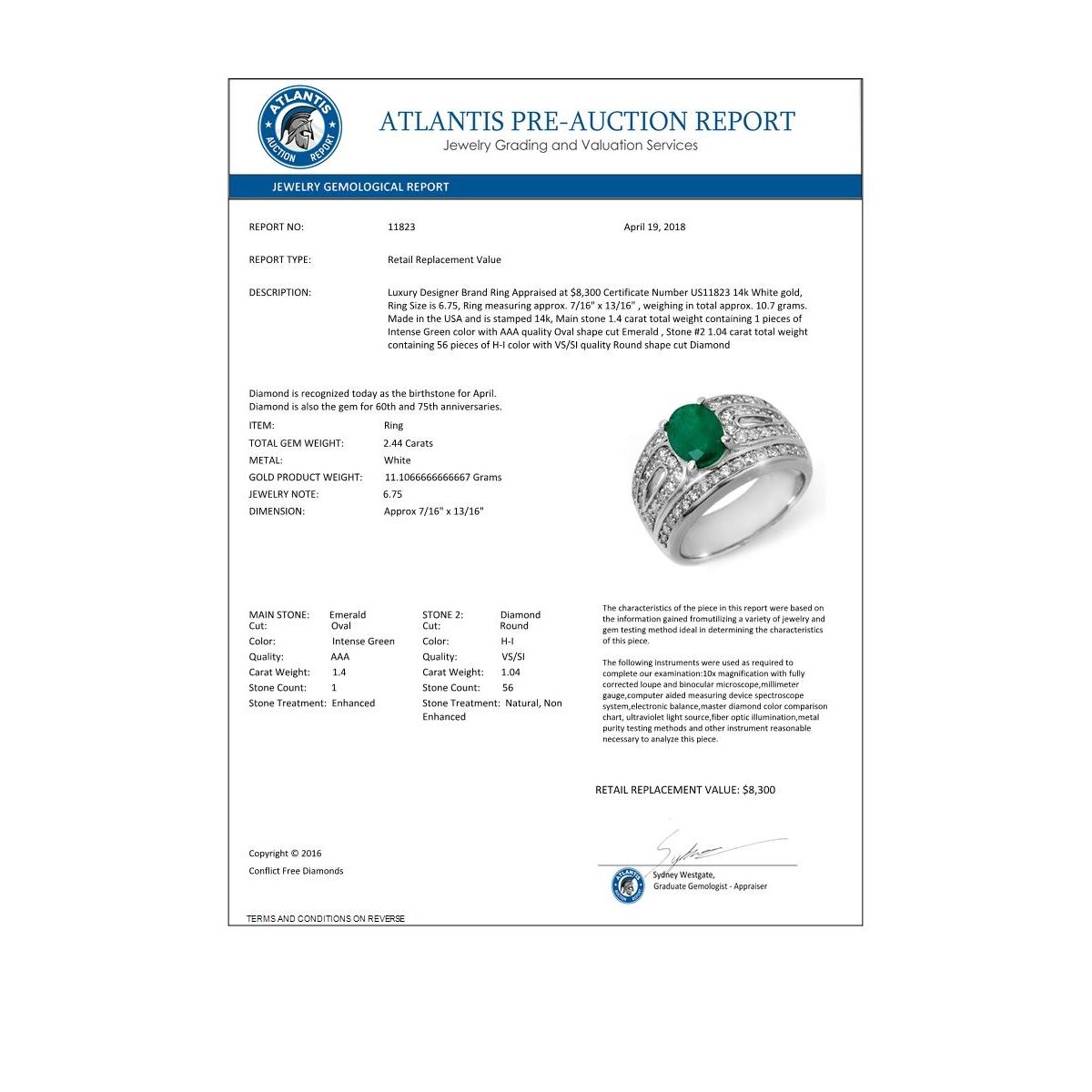 REF-115A8X -11823 ---- 2.44 CTW Emerald & Diamond Ring 14K White Gold ---- Luxury Designer Brand Ring Appraised at $8,300 Certificate Number US11823 14k White gold, Ring Size is 6.75, Ring measuring approx. 7/16" x 13/16" , weighing in total approx. 10.7 grams. Made in the USA and is stamped 14k, Main stone 1.4 carat total weight containing 1 pieces of Intense Green color with AAA quality Oval shape cut Emerald , Stone #2 1.04 carat total weight containing 56 pieces of H-I color with VS/SI quality Round shape cut Diamond