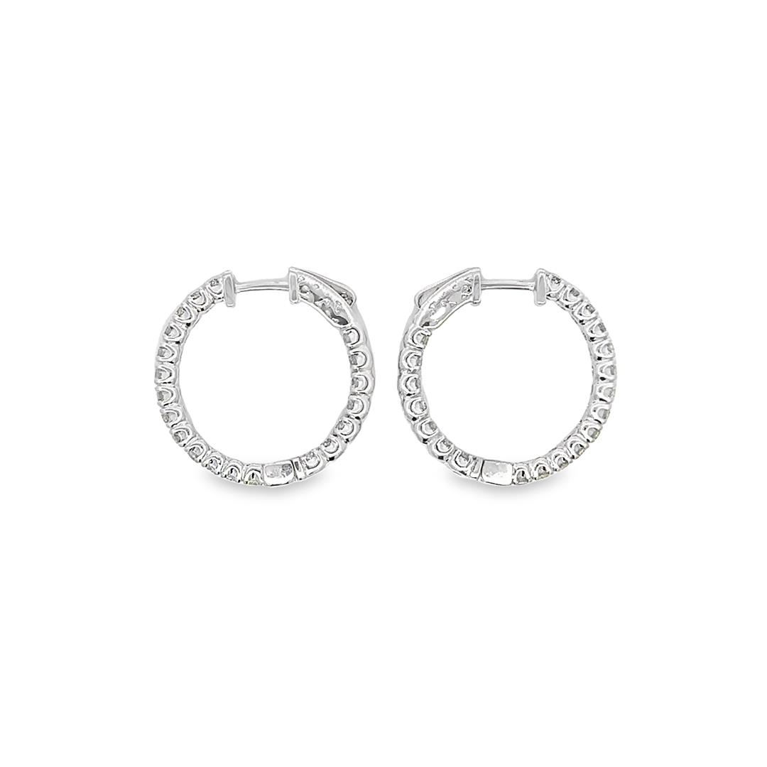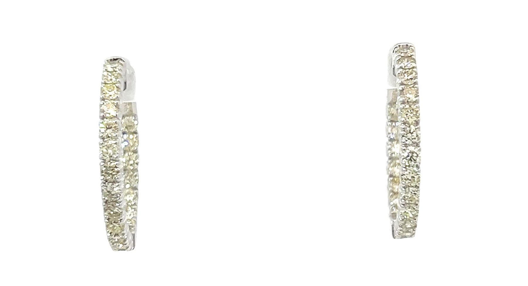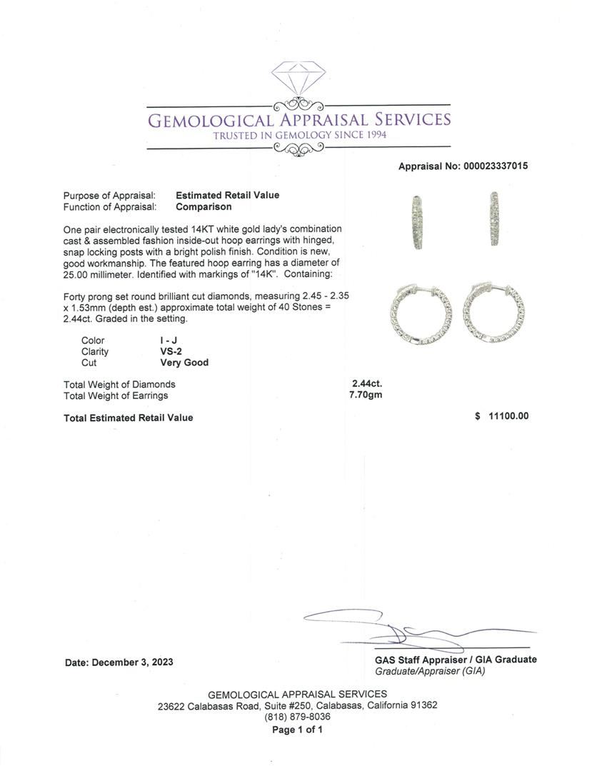 One pair electronically tested 14KT white gold lady's combination cast & assembled fashion inside-out hoop earrings with hinged, snap locking posts with a bright polish finish. The featured hoop earring has a diameter of 25.00 millimeter. Identified with markings of "14K". Condition is new, good workmanship. Containing: Forty prong set round brilliant cut diamonds, measuring 2.45 - 2.35 x 1.53mm (depth est.) approximate total weight of 40 Stones = 2.44ct. Graded in the setting. Color I - J Clarity VS-2 Cut Very Good Total Weight of Diamonds 2.44ct. Total Weight of Earrings 7.70gm Estimated Retail Value $ 11100.00