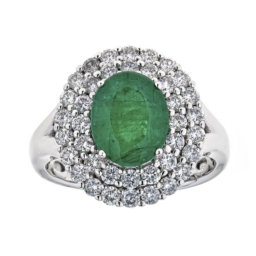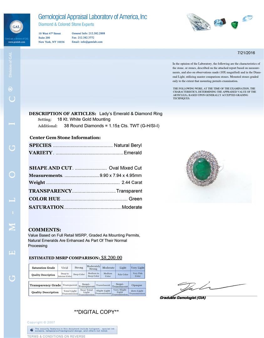 One Lady's Emerald and Diamond Ring. Setting: 18 KT White Gold Mounting. Additional: 38 Round Diamonds = 1.15 Cts. TWT (G-H/SI-I). Center Gem Stone Information: Species: Natural Beryl. Variety: Emerald. Shape and Cut: Oval Mixed Cut. Measurements: 9.90 x 7.94 x 4.95 mm. Weight: 2.44 Carat. Transparency: Transparent. Color Hue: Green. Saturation: Moderate. Total Weight: 6.54 grams.