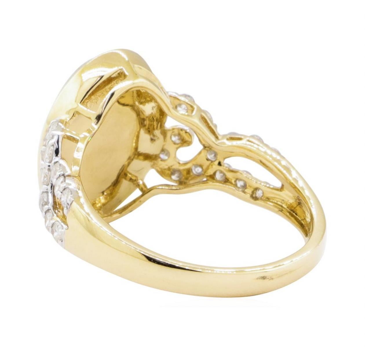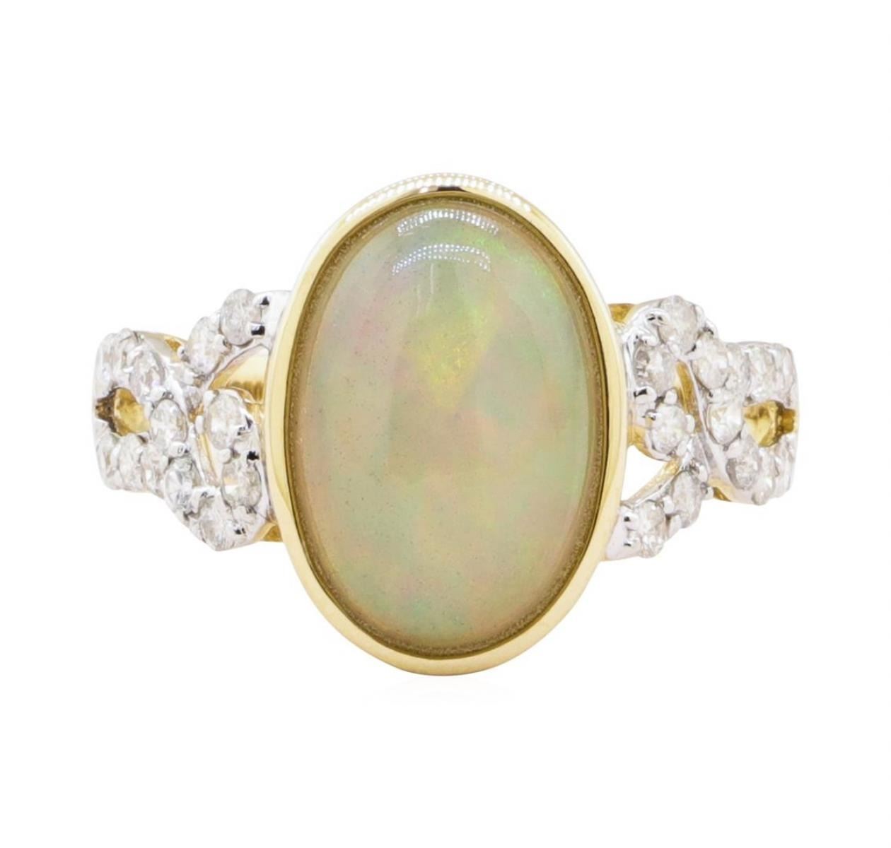 One ladies 14k yellow gold Diamond Ring weighing approx. 4.00 grams. Containing: One Oval Cabochon Opal weighing approx. 2.44 carat and 26 Round Brilliant cut Diamonds total weight approx. 0.48 carat Gem Type: Opal Shape/cut:: Oval Cabochon Carat weight: Approx. 2.44 carat Measurements: Approx. 12.50 x 8.50 mm Setting: Bezel set Gem Type: Diamond Shape/cut: Round Brilliant cut Carat weight: Total approx. 0.48 carat Color: H - J Clarity: I1 - I2 Metal Content: 14k Yellow Gold Setting: Prong set ESTIMIATED RETAIL REPLACEMENT VALUE; $2, 973.00 US