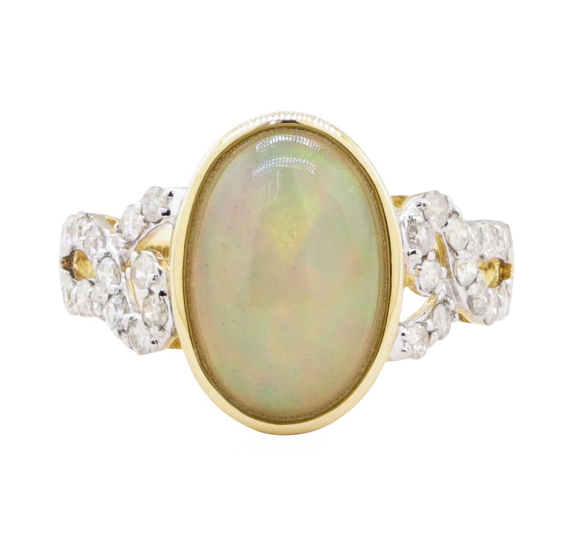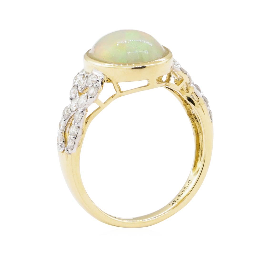 One ladies 14k yellow gold Diamond Ring weighing approx. 4.00 grams. Containing: One Oval Cabochon Opal weighing approx. 2.44 carat and 26 Round Brilliant cut Diamonds total weight approx. 0.48 carat Gem Type: Opal Shape/cut:: Oval Cabochon Carat weight: Approx. 2.44 carat Measurements: Approx. 12.50 x 8.50 mm Setting: Bezel set Gem Type: Diamond Shape/cut: Round Brilliant cut Carat weight: Total approx. 0.48 carat Color: H - J Clarity: I1 - I2 Metal Content: 14k Yellow Gold Setting: Prong set ESTIMIATED RETAIL REPLACEMENT VALUE; $2, 973.00 US