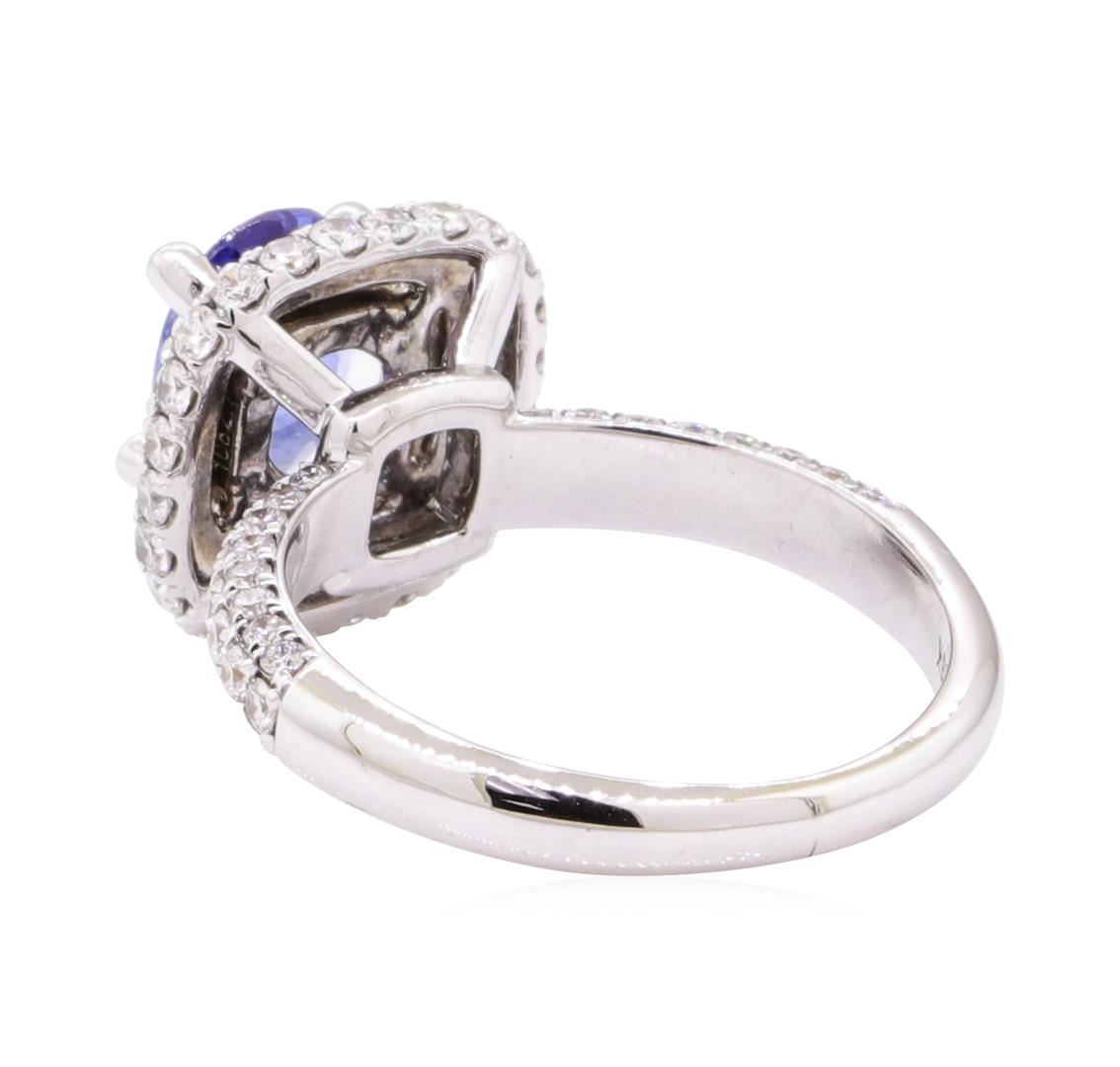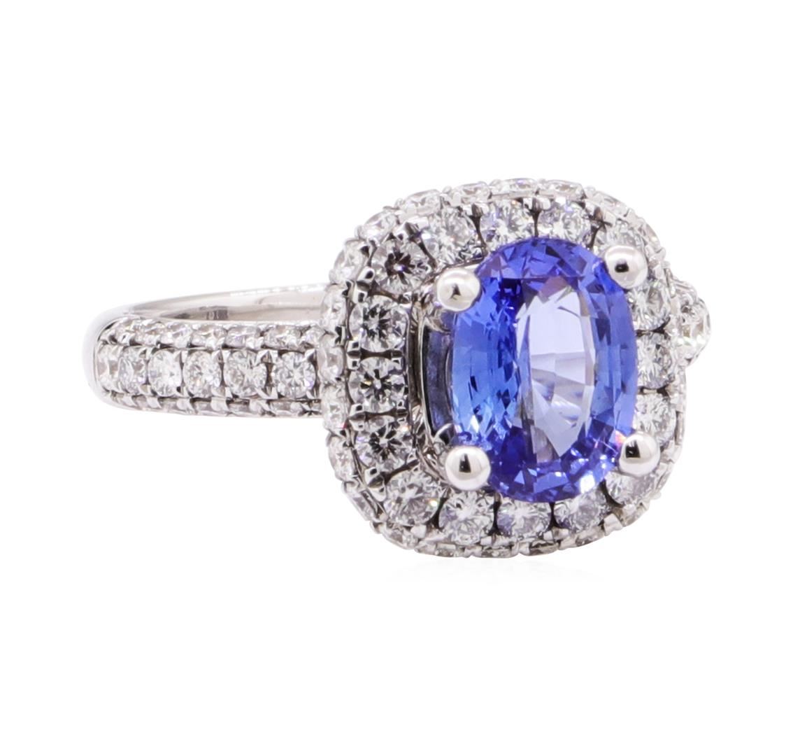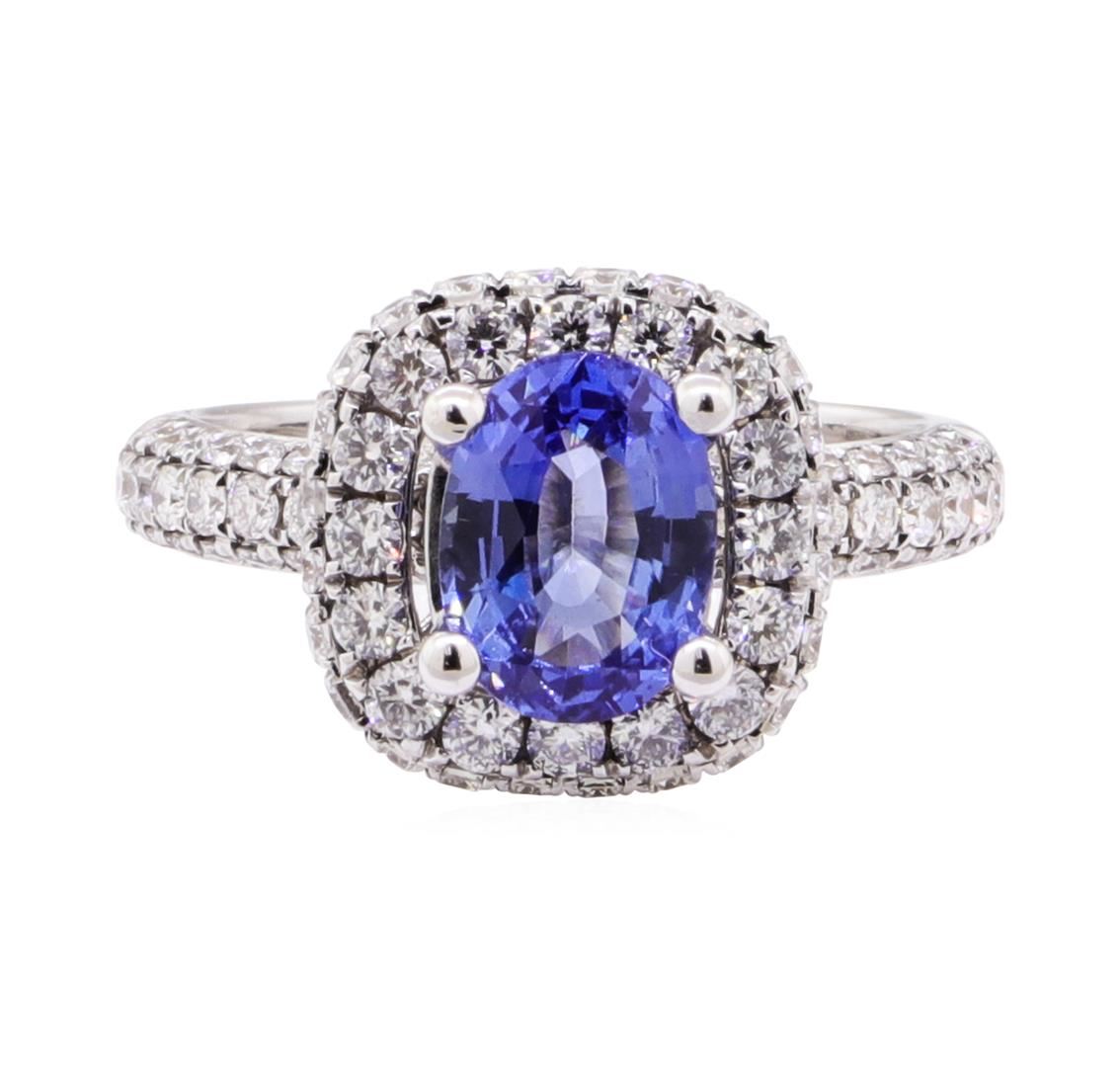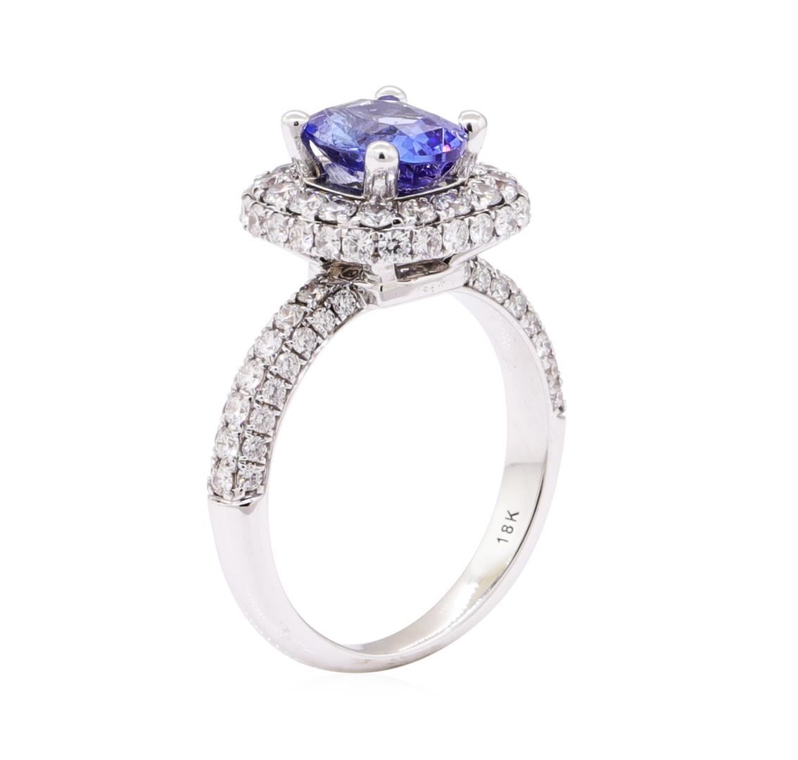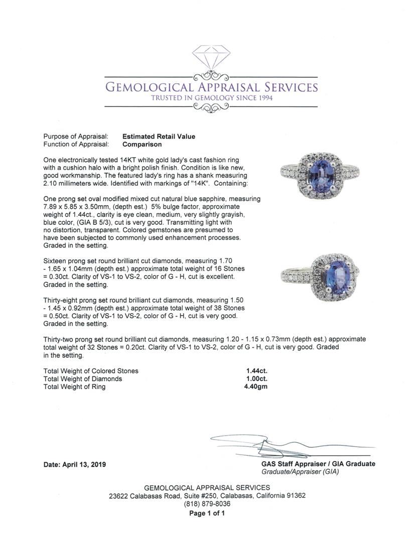 One electronically tested 14KT white gold lady's cast fashion ring with a cushion halo with a bright polish finish. The featured lady's ring has a shank measuring 2.10 millimeters wide. Identified with markings of '14K'. Condition is like new, good workmanship. Containing: One prong set oval modified mixed cut natural blue sapphire, measuring 7.89 x 5.85 x 3.50mm, (depth est.) 5%. bulge factor, approximate weight of 1.44ct., clarity is eye clean, medium, very slightly grayish, blue color, (GIA B 5/3), cut is very good. Transmitting light with no distortion, transparent. Colored gemstones are presumed to have been subjected to commonly used enhancement processes. Graded in the setting. Sixteen prong set round brilliant cut diamonds, measuring 1.70 - 1.65 x 1.04mm (depth est.) approximate total weight of 16 Stones = 0.30ct. Graded in the setting. Color G - H Clarity VS-1 to VS-2 Cut Excellent Thirty-Eight prong set round brilliant cut diamonds, measuring 1.50 - 1.45 x 0.92mm (depth est.) approximate total weight of 38 Stones = 0.50ct. Graded in the setting. Color G - H Clarity VS-1 to VS-2 Cut Very Good Thirty-Two prong set round brilliant cut diamonds, measuring 1.20 - 1.15 x 0.73mm (depth est.) approximate total weight of 32 Stones = 0.20ct. Graded in the setting. Color G - H Clarity VS-1 to VS-2 Cut Very Good. Total Weight of Colored Stones 1.44ct.. Total Weight of Diamonds 1.00ct.. Total Weight of Ring 4.40gm GAS Appraised at $6165.00. GAS Appraised at $6,165.00.