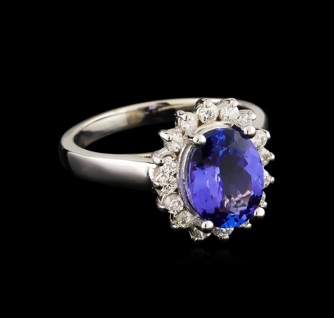 One electronically tested 14KT white gold lady's cast fashion ring with a basket halo with a bright polish finish. The featured lady's ring has a shank measuring 2.33 millimeters wide. Identified with markings of "14K". Condition is new, good workmanship. Containing: One prong set oval modified brilliant cut natural tanzanite, measuring 9.73 x 7.47 x 4.61mm, approximate weight of 2.44ct., clarity is eye clean, medium, moderately strong, violetish blue color, (GIA vB 5/4), cut is very good. Transmitting light with no distortion, transparent. Colored gemstones are presumed to have been subjected to commonly used enhancement processes. Graded in the setting. Sixteen prong set round brilliant cut diamonds, measuring 1.90 - 1.80 x 1.15mm (depth est.) approximate total weight of 16 Stones = 0.39ct. Graded in the setting. Clarity: SI-1 to SI-2. Color: H - I. Cut Good. Total Weight of Colored Stones 2.44ct. Total Weight of Diamonds 0.39ct. Total Weight of Ring 5.30gm. GAS Appraised at $5,225.00.