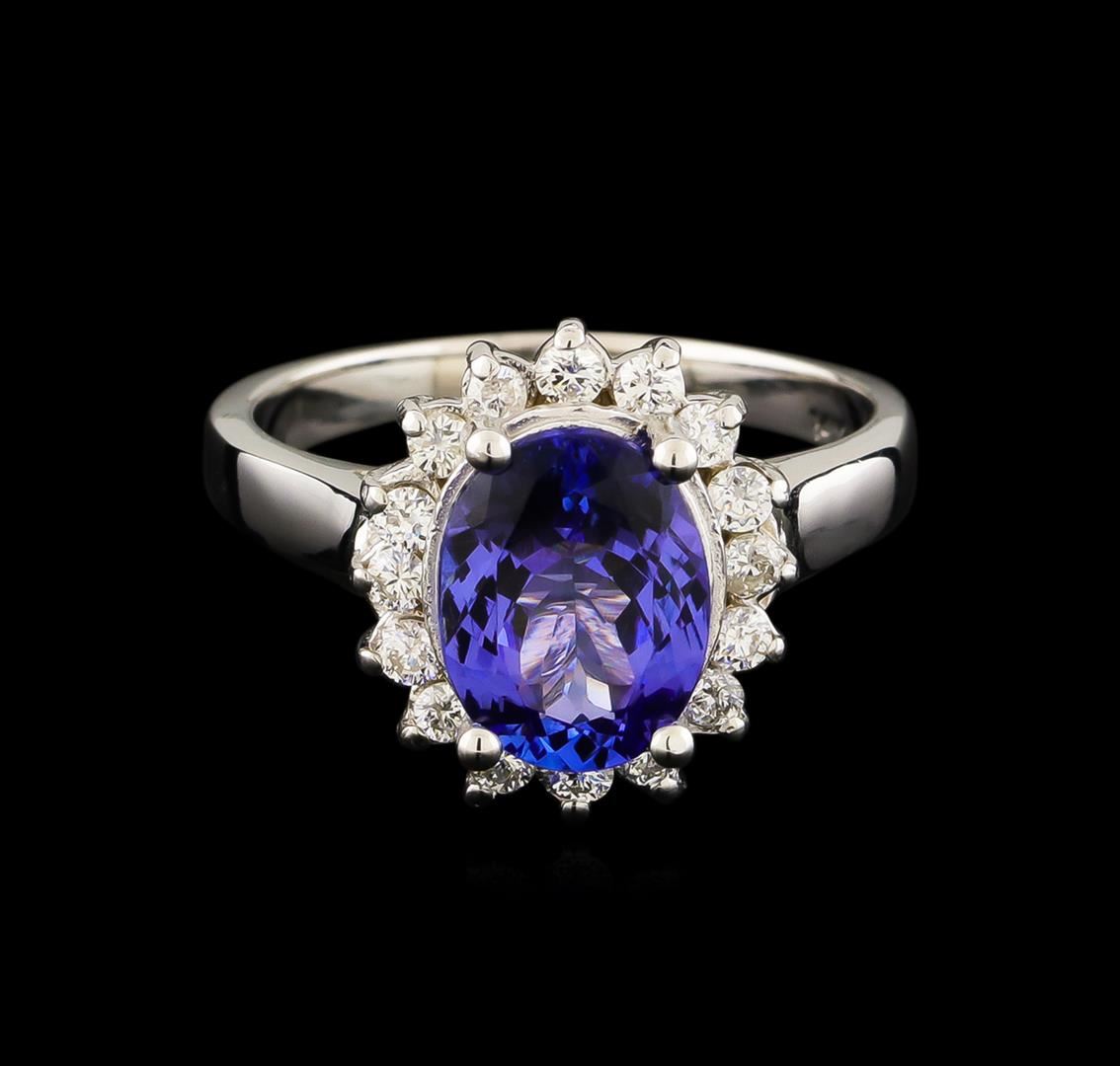 One electronically tested 14KT white gold lady's cast fashion ring with a basket halo with a bright polish finish. The featured lady's ring has a shank measuring 2.33 millimeters wide. Identified with markings of "14K". Condition is new, good workmanship. Containing: One prong set oval modified brilliant cut natural tanzanite, measuring 9.73 x 7.47 x 4.61mm, approximate weight of 2.44ct., clarity is eye clean, medium, moderately strong, violetish blue color, (GIA vB 5/4), cut is very good. Transmitting light with no distortion, transparent. Colored gemstones are presumed to have been subjected to commonly used enhancement processes. Graded in the setting. Sixteen prong set round brilliant cut diamonds, measuring 1.90 - 1.80 x 1.15mm (depth est.) approximate total weight of 16 Stones = 0.39ct. Graded in the setting. Clarity: SI-1 to SI-2. Color: H - I. Cut Good. Total Weight of Colored Stones 2.44ct. Total Weight of Diamonds 0.39ct. Total Weight of Ring 5.30gm. GAS Appraised at $5,225.00.