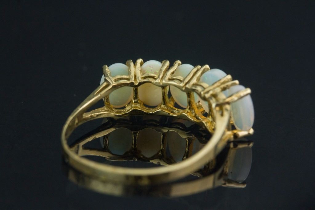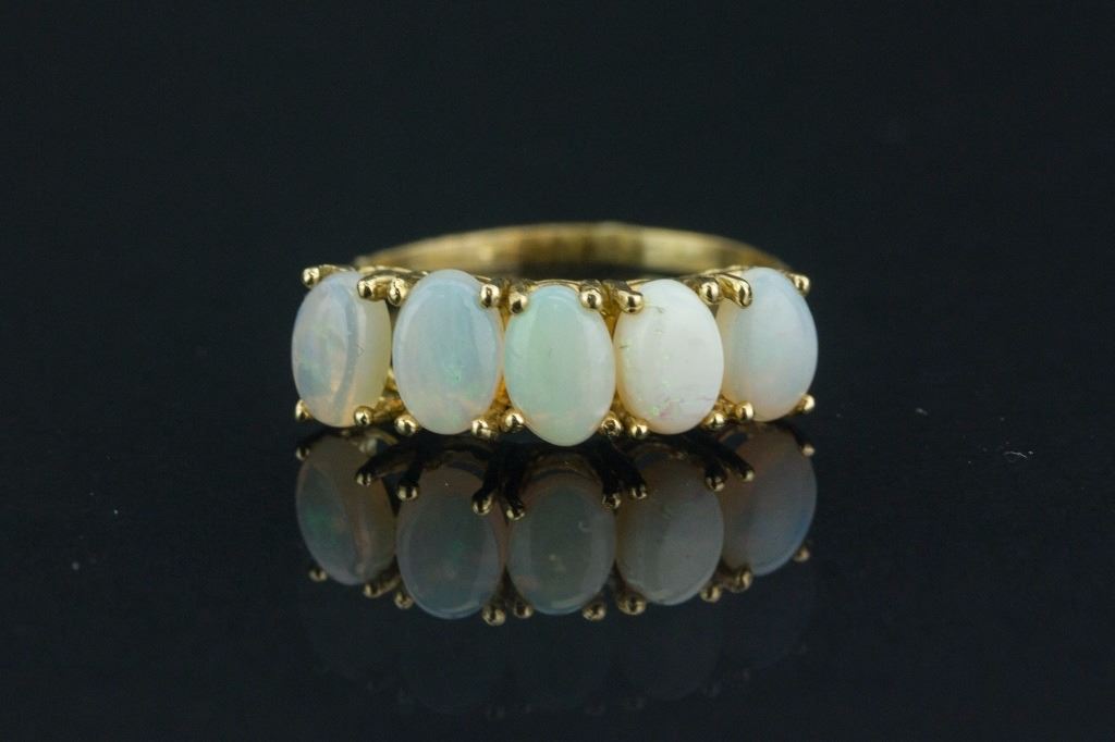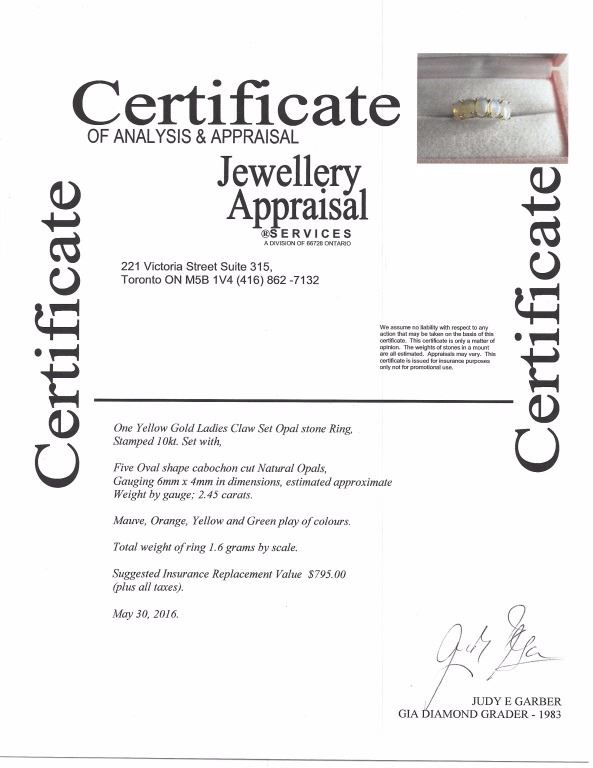 Stamped 10k yellow glod gemstone ring; set with five 2.45 ct oval shape cabochon cut natural opals; certified replacement value CAD$795; 1.6 grams
