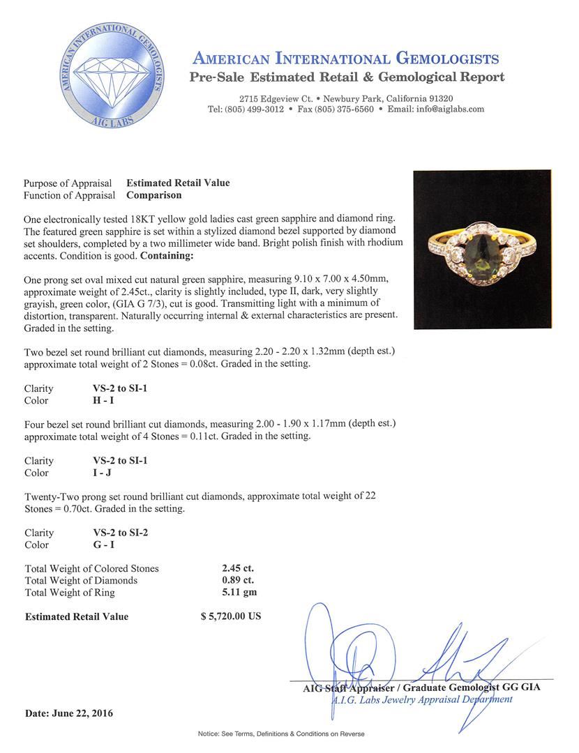 One electronically tested 18KT yellow gold ladies cast green sapphire and diamond ring. The featured green sapphire is set within a stylized diamond bezel supported by diamond set shoulders, completed by a two millimeter wide band. Bright polish finish with rhodium accents. Condition is good. Containing: One prong set oval mixed cut natural green sapphire, measuring 9.10 x 7.00. x 4.50mm, approximate weight of 2.45ct., clarity is slightly included, type II, dark, very slightly grayish, green color, (GIA G 7/3), cut is good. Transmitting light with a minimum of distortion, transparent. Naturally occurring internal & external characteristics are present. Graded in the setting. Two bezel set round brilliant cut diamonds, measuring 2.20 - 2.20 x 1.32mm (depth est.) approximate total weight of 2 Stones = 0.08ct. Graded in the setting. Clarity: VS-2 to SI-1 . Color: H - I Four bezel set round brilliant cut diamonds, measuring 2.00. - 1.90 x 1.17mm (depth est.) approximate total weight of 4 Stones = 0.11ct. Graded in the setting. Clarity: VS-2 to SI-1 . Color: I - J Fourteen prong set round brilliant cut diamonds, measuring 2.80 - 1.70 x 1.35mm (depth est.) approximate total weight of 14 Stones = 0.58ct. Graded in the setting. Clarity: VS-2 to SI-2 . Color: G - I Eight prong set round brilliant cut diamonds, measuring 1.60 - 1.50 x 0.93mm (depth est.) approximate total weight of 8 Stones = 0.12ct. Graded in the setting. Clarity: VS-2 to SI-2 . Color: G - I. Total Weight of Colored Stones 2.45ct.. Total Weight of Diamonds 0.89ct.. Total Weight of Ring 5.11gm. AIG Appraised at $5,720.00.