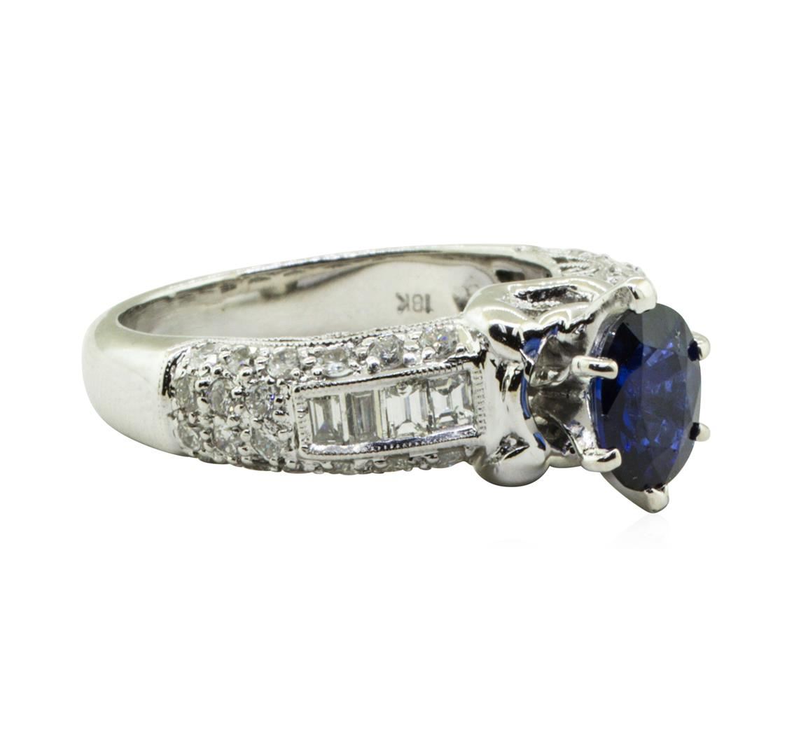 One electronically tested 18KT white gold lady's combination cast & assembled fashion vintage straight line ring with a cathedral shoulders on shank with a bright polish with milgrain detailing finish. The featured lady's ring has a shank measuring 3.50 millimeters in width. Identified with markings of '18K'. Condition is new, good workmanship. Containing: One prong set oval modified mixed cut natural blue sapphire, measuring 7.70 x 5.90 x 3.35mm, (depth est.) 5%. bulge factor, approximate weight of 1.38ct., clarity is eye clean, medium dark, strong, violetish blue color, (GIA vB 6/5), cut is very good. Transmitting light with a minimum of distortion, transparent. Colored gemstones are presumed to have been subjected to commonly used enhancement processes. Graded in the setting. Eight channel set baguette cut diamonds, measuring from 2.30 x 1.60 x 1.36mm (depth est.) to 2.60 x 1.80 x 1.53mm (depth est.) approximate total weight of 8 Stones = 0.44ct. Graded in the setting. Color G - H Clarity SI-1 to SI-2 Cut Good Thirty-Six prong set round brilliant cut diamonds, measuring 1.70 - 1.65 x 1.02mm (depth est.) approximate total weight of 36 Stones = 0.63ct. Graded in the setting. Color H - I Clarity SI-1 to I-1 Cut Good. Total Weight of Colored Stones 1.38ct.. Total Weight of Diamonds 1.07ct.. Total Weight of Straight Line Ring 9.70gm GAS Appraised at $7550.00. GAS Appraised.