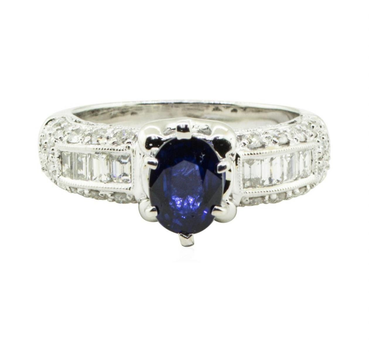 One electronically tested 18KT white gold lady's combination cast & assembled fashion vintage straight line ring with a cathedral shoulders on shank with a bright polish with milgrain detailing finish. The featured lady's ring has a shank measuring 3.50 millimeters in width. Identified with markings of '18K'. Condition is new, good workmanship. Containing: One prong set oval modified mixed cut natural blue sapphire, measuring 7.70 x 5.90 x 3.35mm, (depth est.) 5%. bulge factor, approximate weight of 1.38ct., clarity is eye clean, medium dark, strong, violetish blue color, (GIA vB 6/5), cut is very good. Transmitting light with a minimum of distortion, transparent. Colored gemstones are presumed to have been subjected to commonly used enhancement processes. Graded in the setting. Eight channel set baguette cut diamonds, measuring from 2.30 x 1.60 x 1.36mm (depth est.) to 2.60 x 1.80 x 1.53mm (depth est.) approximate total weight of 8 Stones = 0.44ct. Graded in the setting. Color G - H Clarity SI-1 to SI-2 Cut Good Thirty-Six prong set round brilliant cut diamonds, measuring 1.70 - 1.65 x 1.02mm (depth est.) approximate total weight of 36 Stones = 0.63ct. Graded in the setting. Color H - I Clarity SI-1 to I-1 Cut Good. Total Weight of Colored Stones 1.38ct.. Total Weight of Diamonds 1.07ct.. Total Weight of Straight Line Ring 9.70gm GAS Appraised at $7550.00. GAS Appraised.