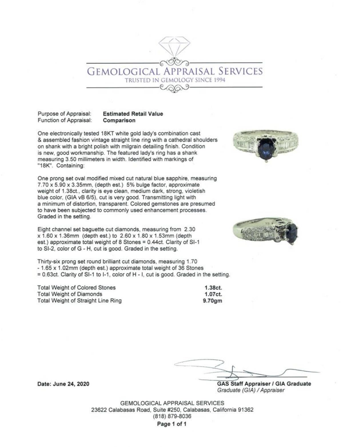 One electronically tested 18KT white gold lady's combination cast & assembled fashion vintage straight line ring with a cathedral shoulders on shank with a bright polish with milgrain detailing finish. The featured lady's ring has a shank measuring 3.50 millimeters in width. Identified with markings of '18K'. Condition is new, good workmanship. Containing: One prong set oval modified mixed cut natural blue sapphire, measuring 7.70 x 5.90 x 3.35mm, (depth est.) 5%. bulge factor, approximate weight of 1.38ct., clarity is eye clean, medium dark, strong, violetish blue color, (GIA vB 6/5), cut is very good. Transmitting light with a minimum of distortion, transparent. Colored gemstones are presumed to have been subjected to commonly used enhancement processes. Graded in the setting. Eight channel set baguette cut diamonds, measuring from 2.30 x 1.60 x 1.36mm (depth est.) to 2.60 x 1.80 x 1.53mm (depth est.) approximate total weight of 8 Stones = 0.44ct. Graded in the setting. Color G - H Clarity SI-1 to SI-2 Cut Good Thirty-Six prong set round brilliant cut diamonds, measuring 1.70 - 1.65 x 1.02mm (depth est.) approximate total weight of 36 Stones = 0.63ct. Graded in the setting. Color H - I Clarity SI-1 to I-1 Cut Good. Total Weight of Colored Stones 1.38ct.. Total Weight of Diamonds 1.07ct.. Total Weight of Straight Line Ring 9.70gm GAS Appraised at $7550.00. GAS Appraised.