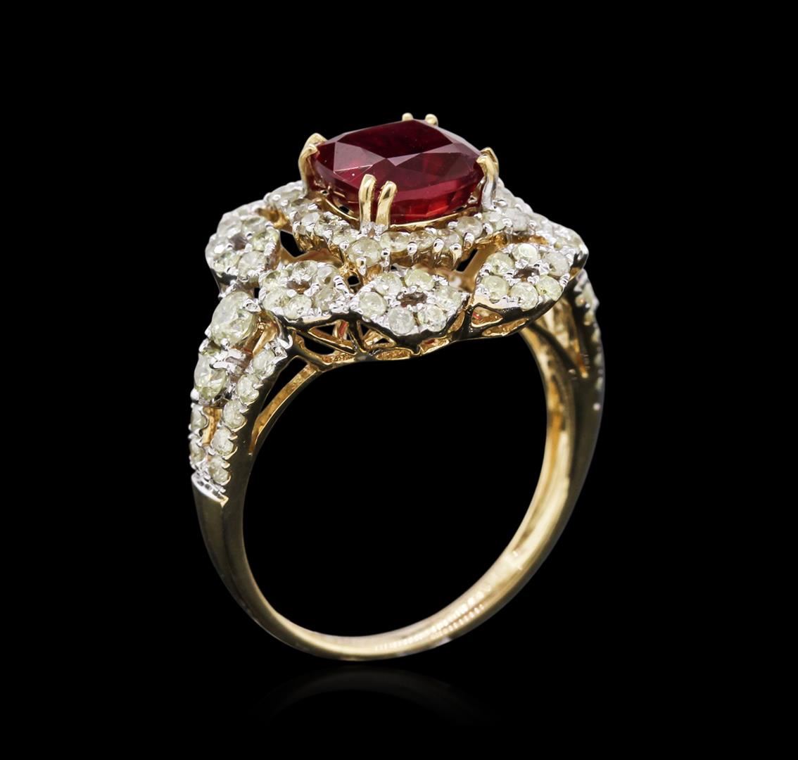 Fourteen karat (14K) yellow gold ruby and diamond ring. A cushion cut ruby corundum gemstone is prong mounted in the center of the ring. Round brilliant cut diamonds accent the ring around the center gemstone and on both sides. The ring is cast stamped "14K" and has a gross weight of 4.2 Grams. Diamond(s): Shape: Round Brilliant Cut. Weight: 1.28 carat. Average Clarity: I1-I2. Average Color: I-K. Symmetry: Very Good. Polish: Very Good. Gemstone(s): GemStone: Ruby Corundum. Nature: Natural. Shape: Cushion, Faceted. Quantity: 1, Mounted. Weight 2.45 carat. Dimensions: Length-7.28mm. ; Width- 7.26 mm. Bulge: Visible. Clarity: I1, Type 3. Color: Red (5/5). Symmetry: Very Good. Color Intensity: Medium. Transparency: Transparent. Tone: Dark. Enhancements: Indications of high temperature heat treatment, with glass and flux additives. Metal(s): Metal: Gold, Stamped. Purity: 14K. Color: Yellow. Condition: Excellent. Finish: High polish. GGA Appraised.