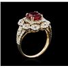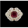 Fourteen karat (14K) yellow gold ruby and diamond ring. A cushion cut ruby corundum gemstone is prong mounted in the center of the ring. Round brilliant cut diamonds accent the ring around the center gemstone and on both sides. The ring is cast stamped "14K" and has a gross weight of 4.2 Grams. Diamond(s): Shape: Round Brilliant Cut. Weight: 1.28 carat. Average Clarity: I1-I2. Average Color: I-K. Symmetry: Very Good. Polish: Very Good. Gemstone(s): GemStone: Ruby Corundum. Nature: Natural. Shape: Cushion, Faceted. Quantity: 1, Mounted. Weight 2.45 carat. Dimensions: Length-7.28mm. ; Width- 7.26 mm. Bulge: Visible. Clarity: I1, Type 3. Color: Red (5/5). Symmetry: Very Good. Color Intensity: Medium. Transparency: Transparent. Tone: Dark. Enhancements: Indications of high temperature heat treatment, with glass and flux additives. Metal(s): Metal: Gold, Stamped. Purity: 14K. Color: Yellow. Condition: Excellent. Finish: High polish. GGA Appraised.