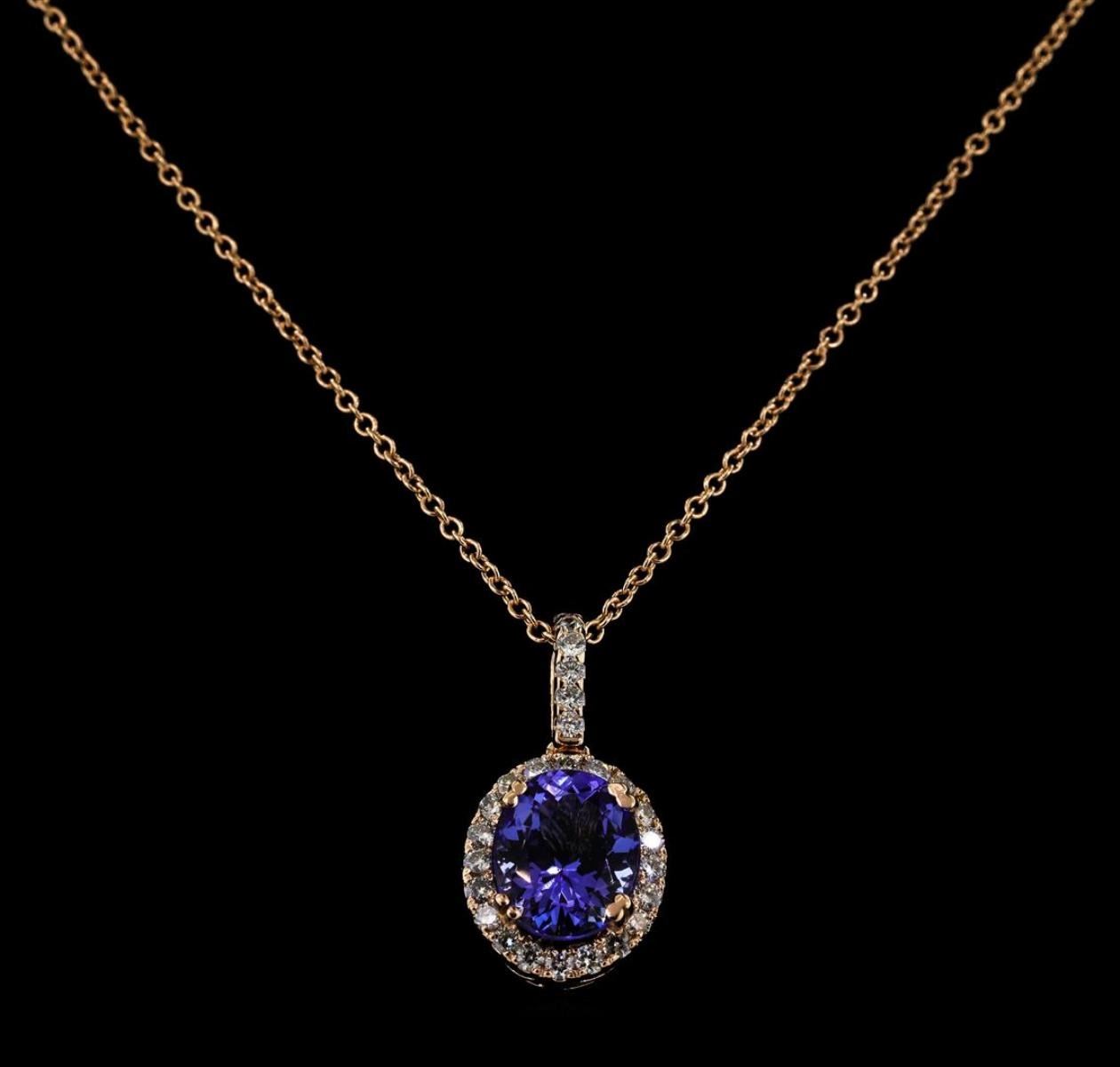 One Tanzanite and Diamond Pendant with Chain including: 14KT Rose Gold weighing a total of 2.00 grams, Tanzanite weighing a total of 2.46ct, and 26 Diamonds weighing a total of 0.35ctw.