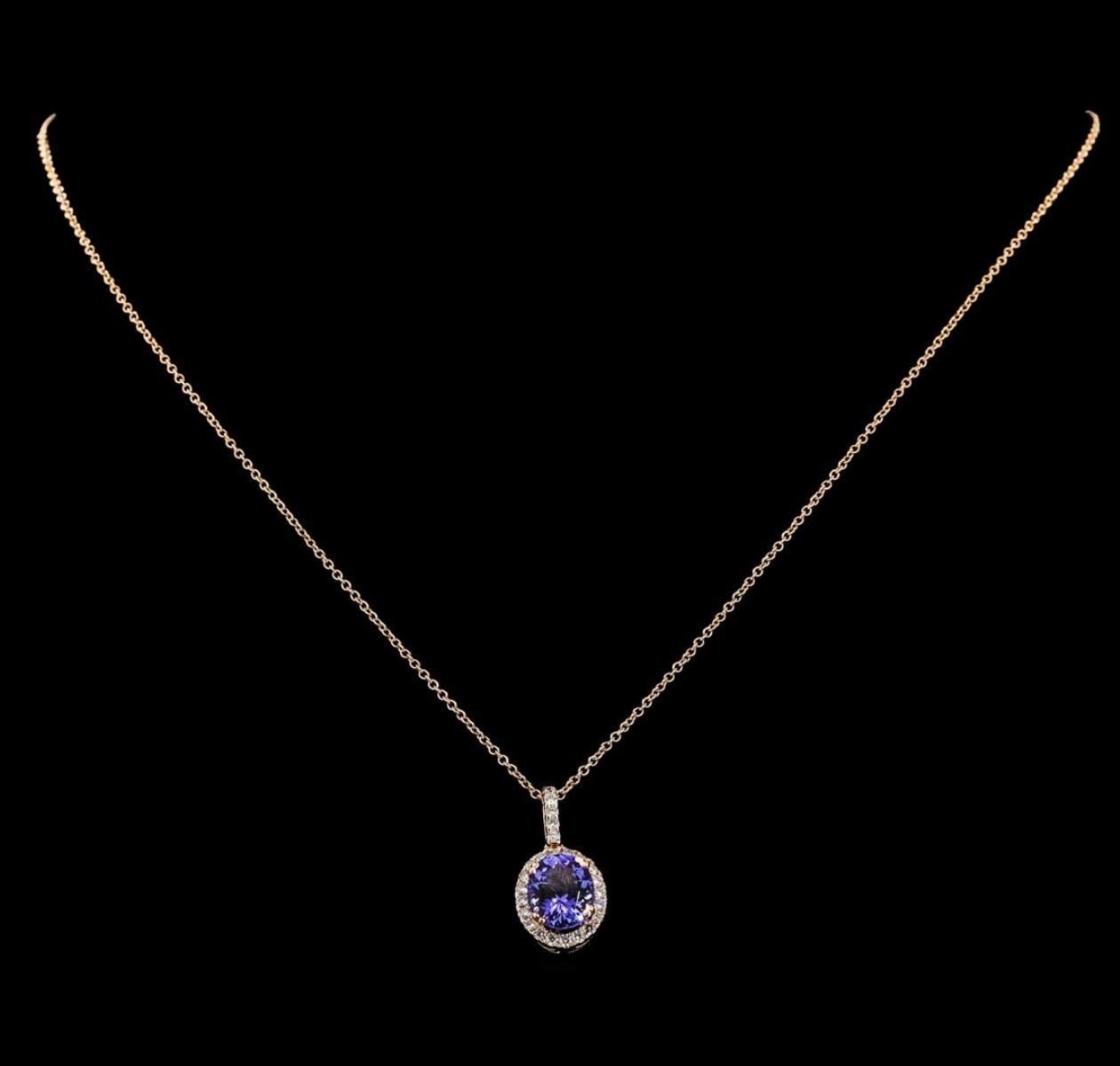 One Tanzanite and Diamond Pendant with Chain including: 14KT Rose Gold weighing a total of 2.00 grams, Tanzanite weighing a total of 2.46ct, and 26 Diamonds weighing a total of 0.35ctw.