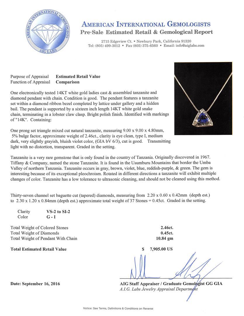 One electronically tested 14KT white gold ladies cast & assembled tanzanite and diamond pendant with chain. The pendant features a tanzanite set within a diamond ribbon bezel completed by lattice under gallery and a hidden bail. The pendant is supported by a sixteen inch length 14KT white gold snake chain, terminating in a lobster claw clasp. Bright polish finish. Identified with markings of '14K'. Condition is good. Containing: One prong set triangle mixed cut natural tanzanite, measuring 9.00 x 9.00 x 4.80mm, 5%. bulge factor, approximate weight of 2.46ct., clarity is eye clean, type I, medium dark, very slightly grayish, bluish violet color, (GIA bevy 6/3), cut is good. Transmitting light with no distortion, transparent. Graded in the setting. Tanzanite is a very rare gemstone that is only found in the country of Tanzania. Originally discovered in 1967. Tiffany & Company, named the stone Tanzanite. It is found in the Usumburu Mountains that border the Umba Valley of northern Tanzania. Tanzanite occurs in gray, brown, violet, blue, reddish-purple, & green. The gem is interesting because of its exceptional pleochroism. Rotated in different directions a tanzanite will exhibit multiple changes of color. Tanzanite has a low tolerance to ultrasonic cleaning, and should not be cleaned using this method. Thirty-Seven channel set baguette cut (tapered) diamonds, measuring from 2.20 x 0.60 x 0.42mm (depth est.) to 2.30 x 1.20 x 0.84mm (depth est.) approximate total weight of 37 Stones = 0.45ct. Graded in the setting. Clarity VS-2 to SI-2. Color: G - I. Total Weight of Colored Stones 2.46ct.. Total Weight of Diamonds 0.45ct.. Total Weight of Pendant With Chain 10.84gm. AIG Appraised at $7,905.00.