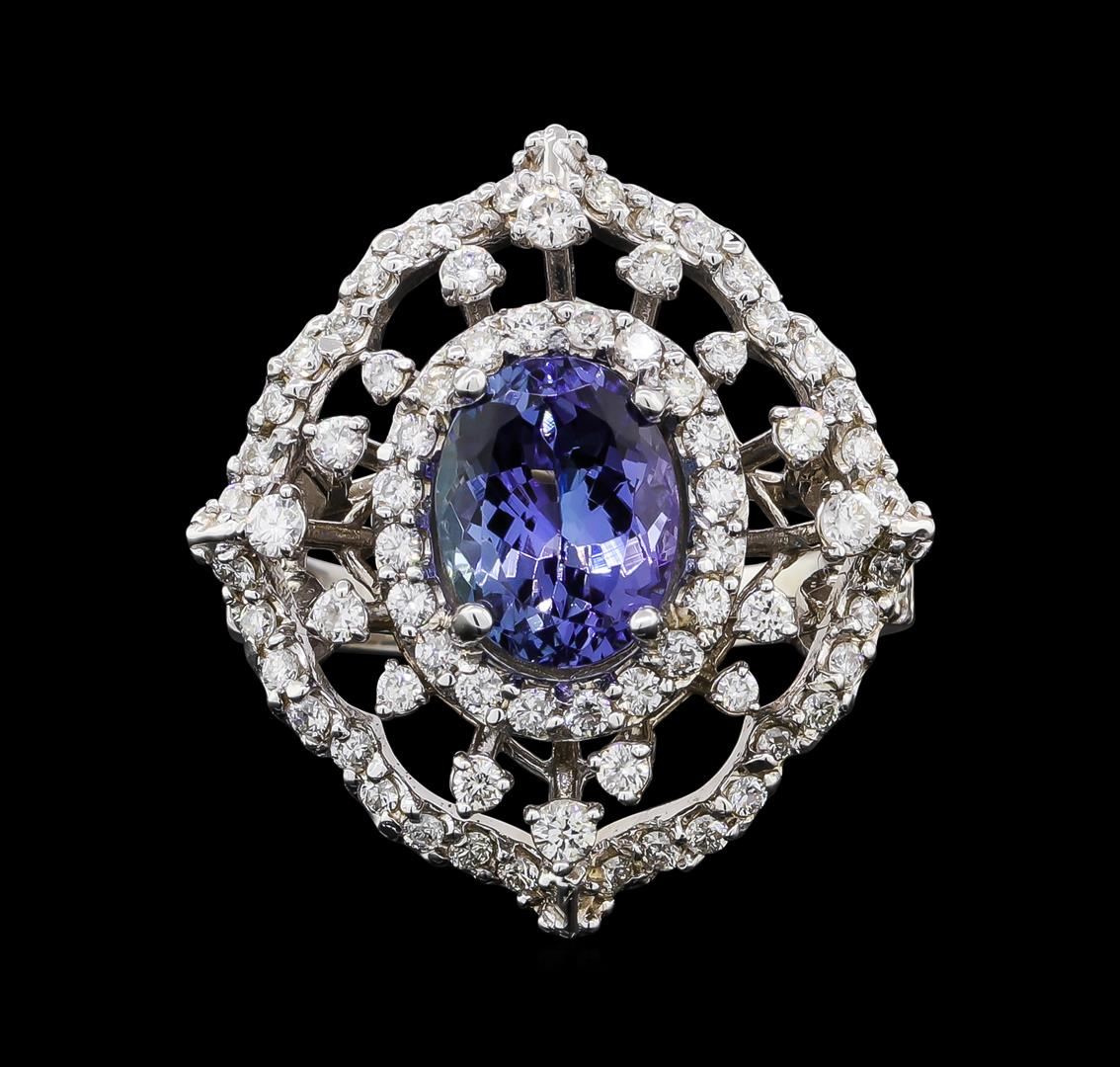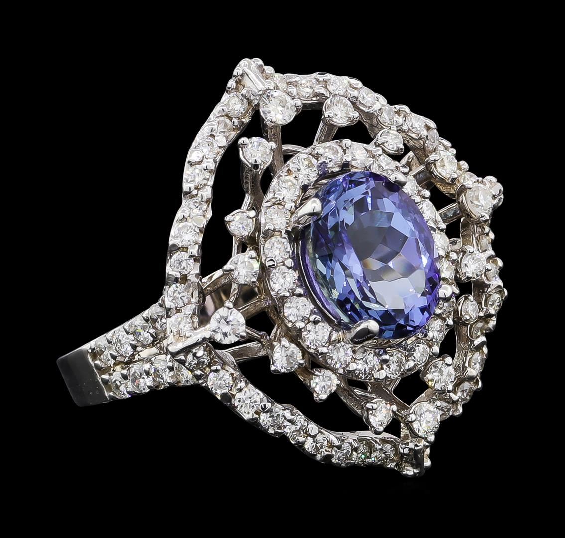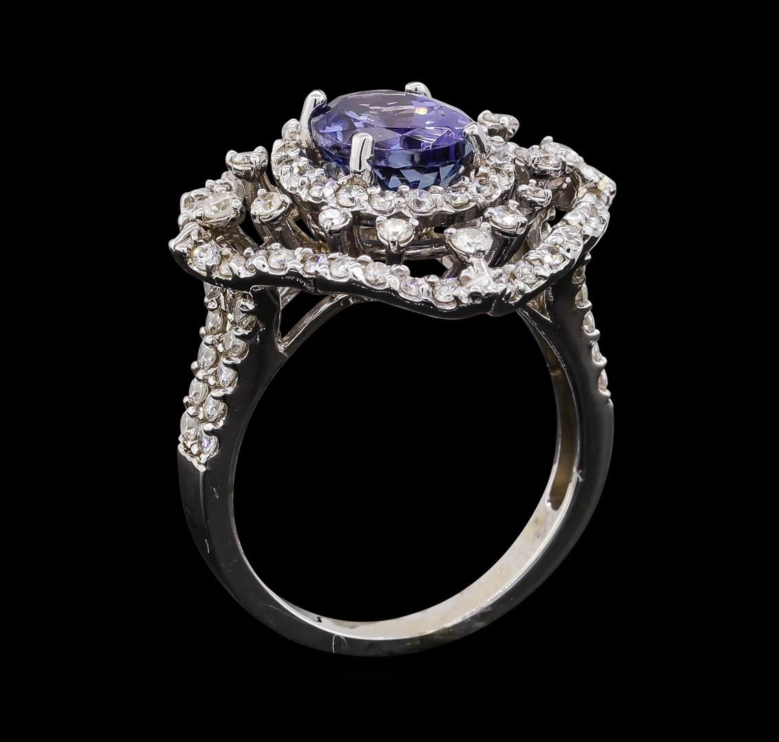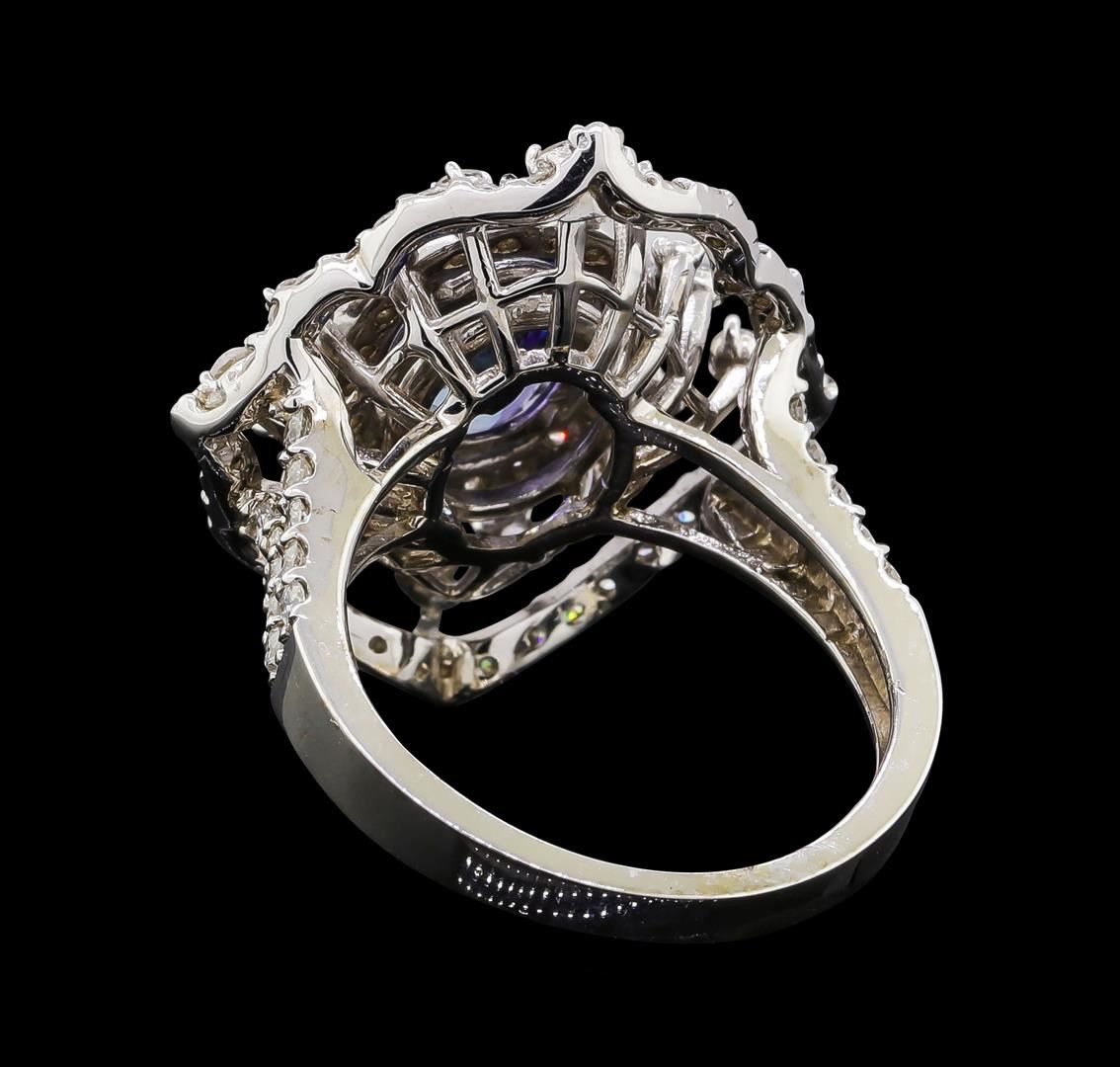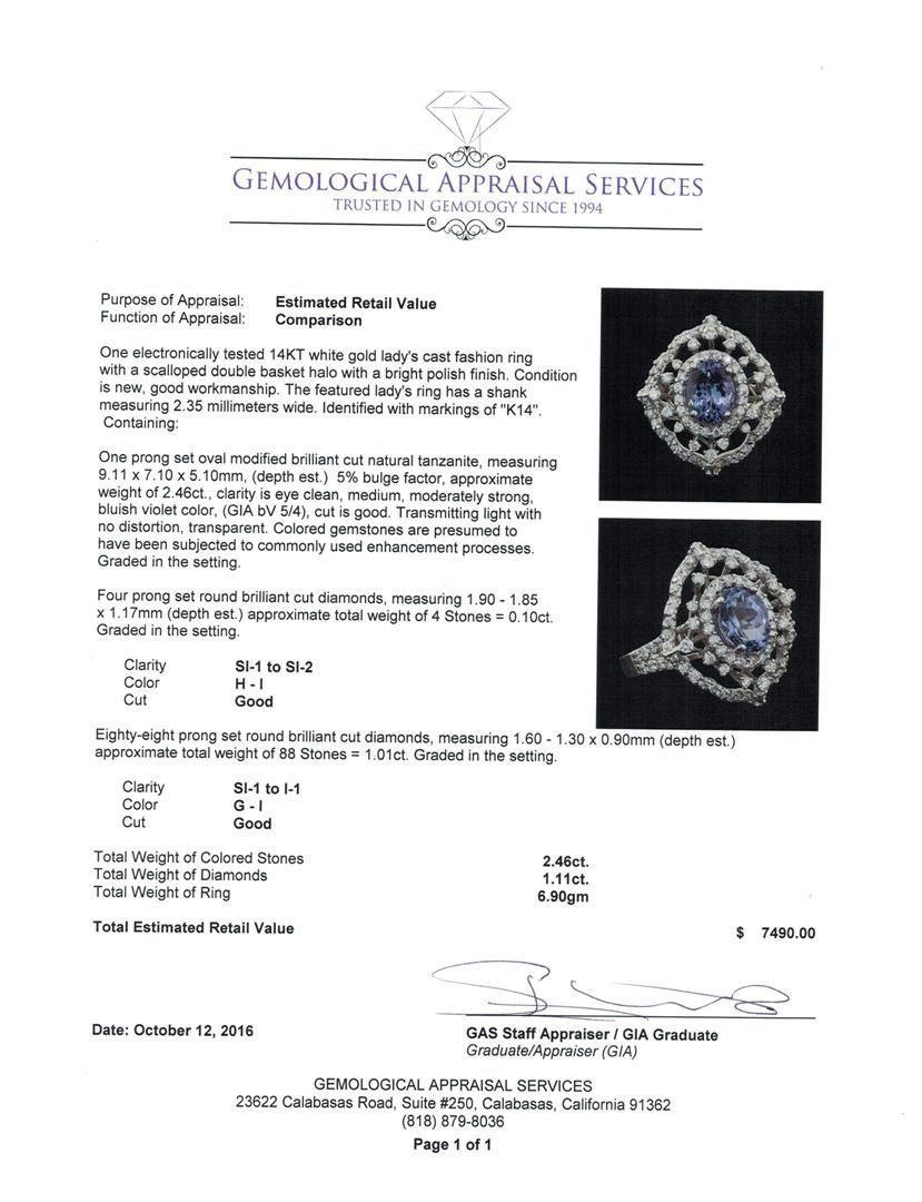 One electronically tested 14KT white gold lady's cast fashion ring with a scalloped double basket halo with a bright polish finish. The featured lady's ring has a shank measuring 2.35 millimeters wide. Identified with markings of 'K14'. Condition is new, good workmanship. Containing: One prong set oval modified brilliant cut natural tanzanite, measuring 9.11 x 7.10 x 5.10mm, (depth est.) 5%. bulge factor, approximate weight of 2.46ct., clarity is eye clean, medium, moderately strong, bluish violet color, (GIA bV 5/4), cut is good. Transmitting light with no distortion, transparent. Colored gemstones are presumed to have been subjected to commonly used enhancement processes. Graded in the setting. Four prong set round brilliant cut diamonds, measuring 1.90 - 1.85 x 1.17mm (depth est.) approximate total weight of 4 Stones = 0.10ct. Graded in the setting. Clarity SI-1 to SI-2. Color: H - I Cut Good Eighty-Eight prong set round brilliant cut diamonds, measuring 1.60 - 1.30 x 0.90mm (depth est.) approximate total weight of 88 Stones = 1.01ct. Graded in the setting. Clarity SI-1 to I-1. Color: G - I Cut Good. Total Weight of Colored Stones 2.46ct.. Total Weight of Diamonds 1.11ct.. Total Weight of Ring 6.90gm. GAS Appraised at $7,490.00.