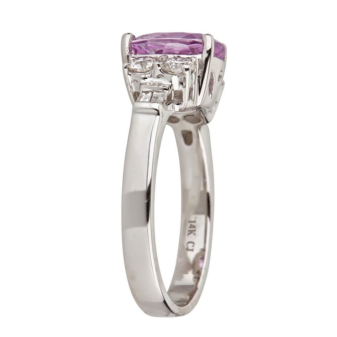 One Kunzite and Diamond Ring featuring: 14KT White Gold with a total weight of 4.24 grams, Kunzite with a total weight of 2.47ct, 4 Round Cut Diamonds with a total weight of 0.51ctw, and 4 Baguette Cut Diamonds with a total weight of 0.08ctw.
