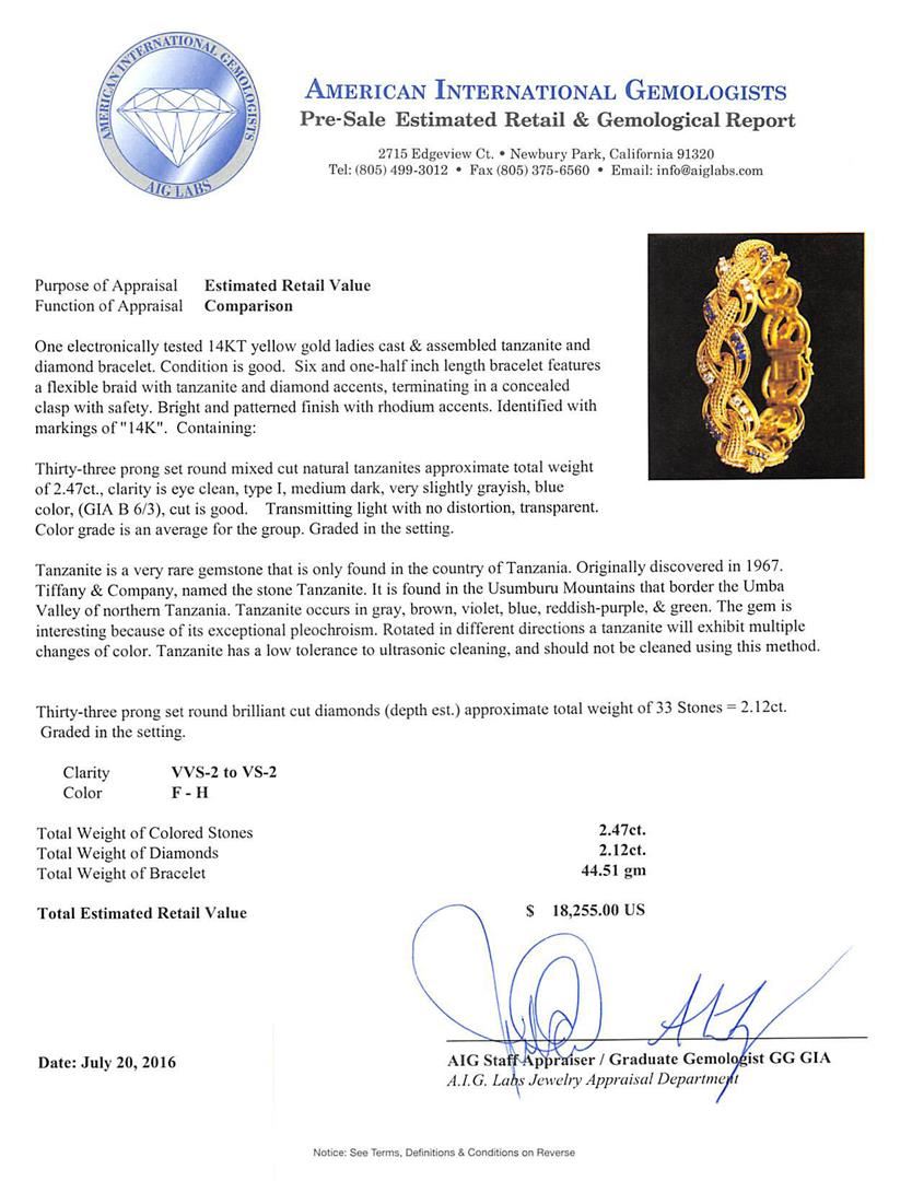 One electronically tested 14KT yellow gold ladies cast & assembled tanzanite and diamond bracelet. Six and one-half inch length bracelet features a flexible braid with tanzanite and diamond accents, terminating in a concealed clasp with safety. Bright and patterned finish with rhodium accents. Identified with markings of '14K'. Condition is good. Containing: Thirty-three prong set round mixed cut natural tanzanites approximate total weight of 2.47ct., clarity is eye clean, type I, medium dark, very slightly grayish, blue color, (GIA B 6/3), cut is good. Transmitting light with no distortion, transparent. Color grade is an average for the group. Graded in the setting. Tanzanite is a very rare gemstone that is only found in the country of Tanzania. Originally discovered in 1967. Tiffany & Company, named the stone Tanzanite. It is found in the Usumburu Mountains that border the Umba Valley of northern Tanzania. Tanzanite occurs in gray, brown, violet, blue, reddish-purple, & green. The gem is interesting because of its exceptional pleochroism. Rotated in different directions a tanzanite will exhibit multiple changes of color. Tanzanite has a low tolerance to ultrasonic cleaning, and should not be cleaned using this method. Thirty-Three prong set round brilliant cut diamonds (depth est.) approximate total weight of 33 Stones = 2.12ct. Graded in the setting. Clarity VVS-2 to VS-2. Color: F - H. Total Weight of Colored Stones 2.47ct.. Total Weight of Diamonds 2.12ct.. Total Weight of Bracelet 44.51gm. AIG Appraised at $18,255.00.
