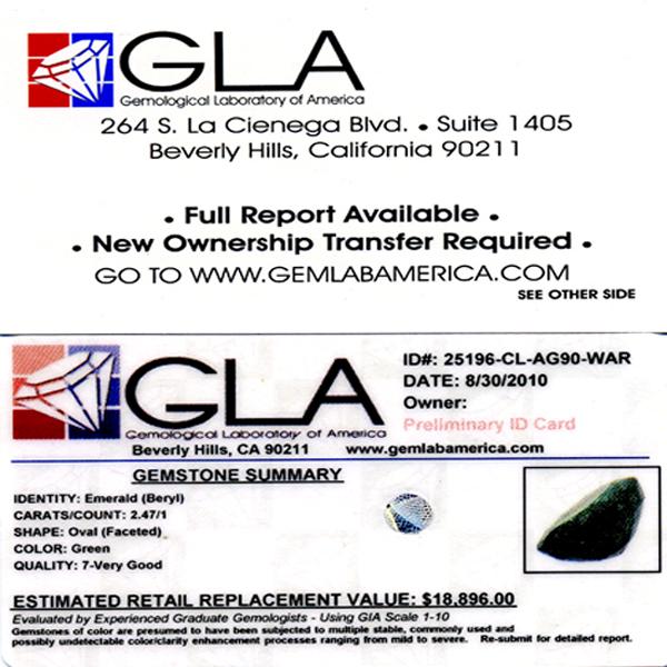 Excellent green colored specimen oval cut; lab quality evaluation 7; treatment as noted; Gem Guide wholesale $2470-$3705; full retail appraisal $18896; full lab evaluation available