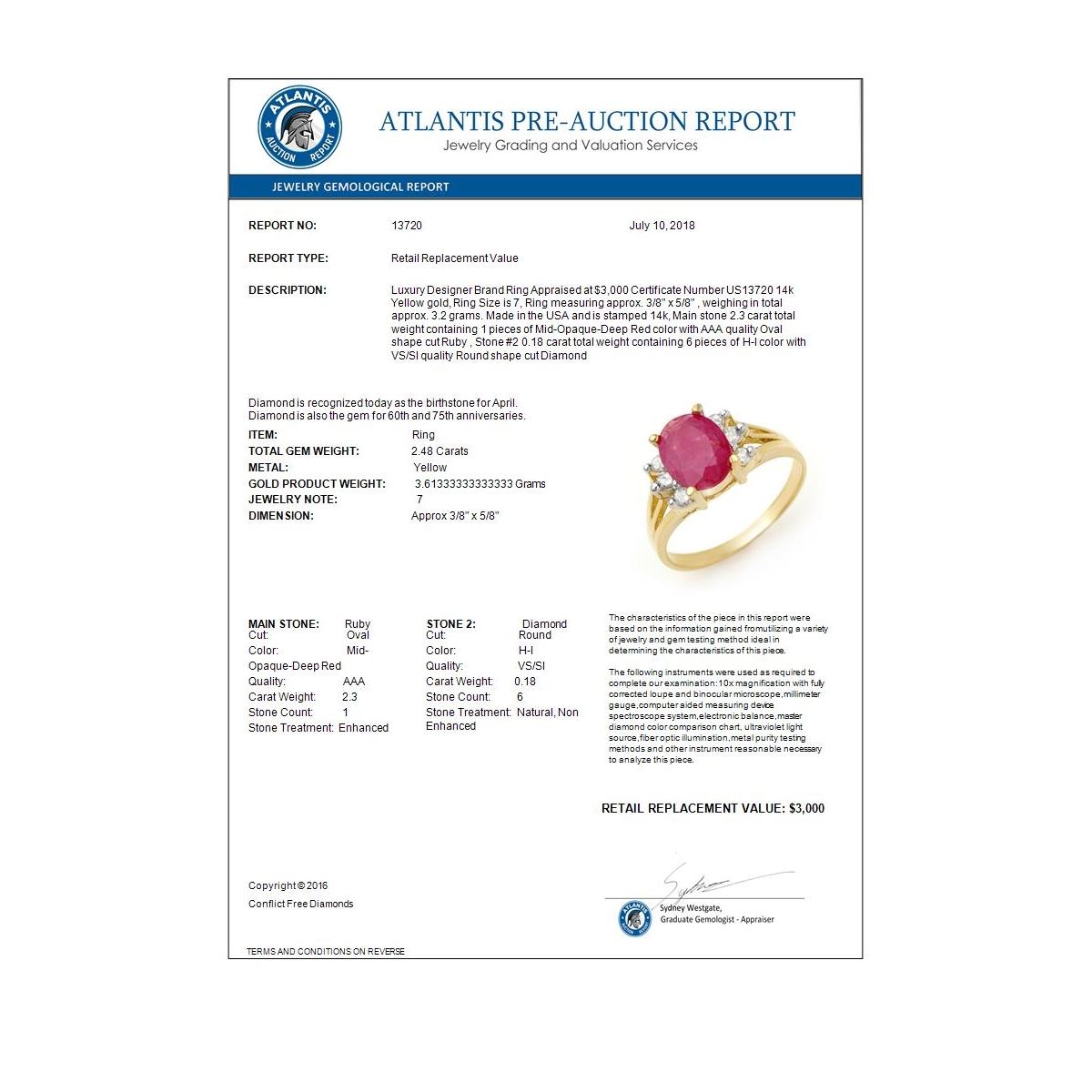 REF-45X5T -13720 ---- 2.48 CTW Ruby & Diamond Ring 14K Yellow Gold ---- Luxury Designer Brand Ring Appraised at $3,000 Certificate Number US13720 14k Yellow gold, Ring Size is 7, Ring measuring approx. 3/8" x 5/8" , weighing in total approx. 3.2 grams. Made in the USA and is stamped 14k, Main stone 2.3 carat total weight containing 1 pieces of Mid-Opaque-Deep Red color with AAA quality Oval shape cut Ruby , Stone #2 0.18 carat total weight containing 6 pieces of H-I color with VS/SI quality Round shape cut Diamond