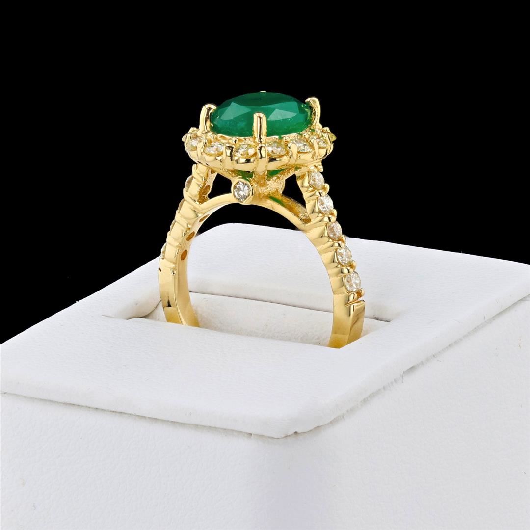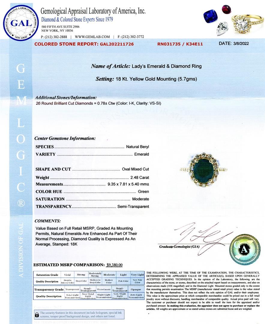 2.48ct Emerald and 0.78ctw Diamond 18K Yellow Diamond Ring. Please see Photos and Description for all available information. This stunning ring features a 2.48ct Emerald with 0.78ctw 26 Round Brilliant Cut Diamonds set in 18K Yellow Gold. It is a perfect gift for any occasion. This Ring is available in a size 6.