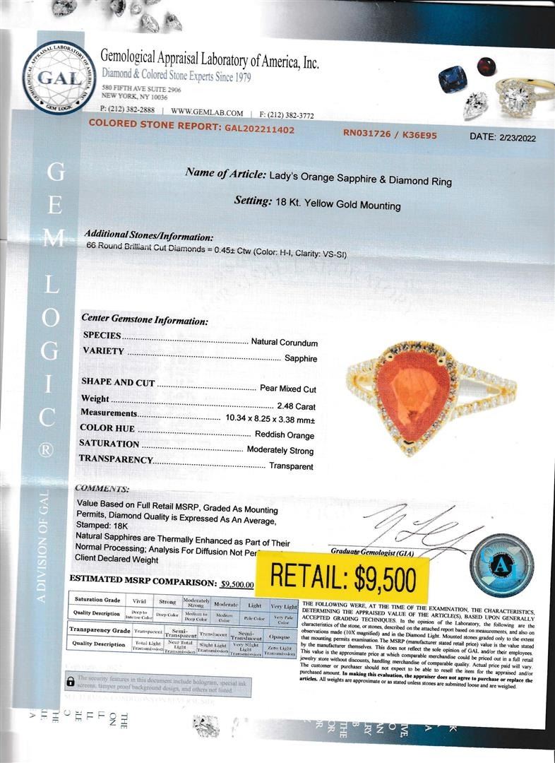 Name of Article: Lady's Orange Sapphire and Diamond Ring Setting: 18 Kt. Yellow Gold Mounting #Additional Stones/Information:# 66 Round Brilliant Cut Diamonds = 0.45+/- Ctw (Color: H-I, Clarity: VS-SI) #Center Gemstone Information:# SPECIES: Natural Corun