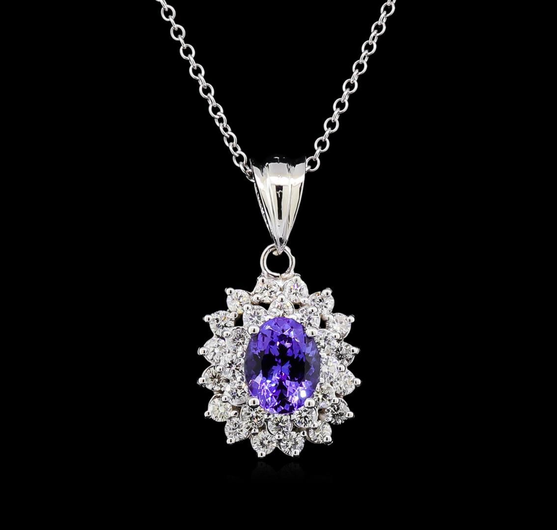 One electronically tested 14KT white gold lady's combination cast & assembled fashion pendant & chain 18.0" long, 1.5 round cable link with a lobster claw clasp with a double halo with a bright polish finish. Identified with markings of "14K". Condition is new, good workmanship. Containing: One diamond(depth est.) approximate weight of 0.00ct. One prong set oval modified brilliant cut natural tanzanite, measuring 9.42 x 7.50 x 5.19mm, (depth est.) approximate weight of 2.48ct., clarity is eye clean, medium dark, moderately strong, bluish violet color, (GIA bV 6/4), cut is very good. Transmitting light with no distortion, transparent. Colored gemstones are presumed to have been subjected to commonly used enhancement processes. Graded in the setting. Twenty-Eight prong set round brilliant cut diamonds, measuring 2.40 - 2.30 x 1.46mm (depth est.) approximate total weight of 28 Stones = 1.35ct. Graded in the setting. Clarity: SI-1 to SI-2. Color: H - I. Cut Good. Total Weight of Colored Stones 2.48ct. Total Weight of Diamonds 1.35ct. Total Weight of Pendant & Chain 7.60gm. GAS Appraised at $7,990.00.