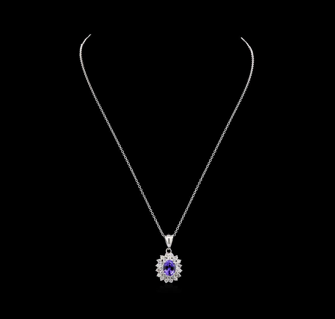 One electronically tested 14KT white gold lady's combination cast & assembled fashion pendant & chain 18.0" long, 1.5 round cable link with a lobster claw clasp with a double halo with a bright polish finish. Identified with markings of "14K". Condition is new, good workmanship. Containing: One diamond(depth est.) approximate weight of 0.00ct. One prong set oval modified brilliant cut natural tanzanite, measuring 9.42 x 7.50 x 5.19mm, (depth est.) approximate weight of 2.48ct., clarity is eye clean, medium dark, moderately strong, bluish violet color, (GIA bV 6/4), cut is very good. Transmitting light with no distortion, transparent. Colored gemstones are presumed to have been subjected to commonly used enhancement processes. Graded in the setting. Twenty-Eight prong set round brilliant cut diamonds, measuring 2.40 - 2.30 x 1.46mm (depth est.) approximate total weight of 28 Stones = 1.35ct. Graded in the setting. Clarity: SI-1 to SI-2. Color: H - I. Cut Good. Total Weight of Colored Stones 2.48ct. Total Weight of Diamonds 1.35ct. Total Weight of Pendant & Chain 7.60gm. GAS Appraised at $7,990.00.