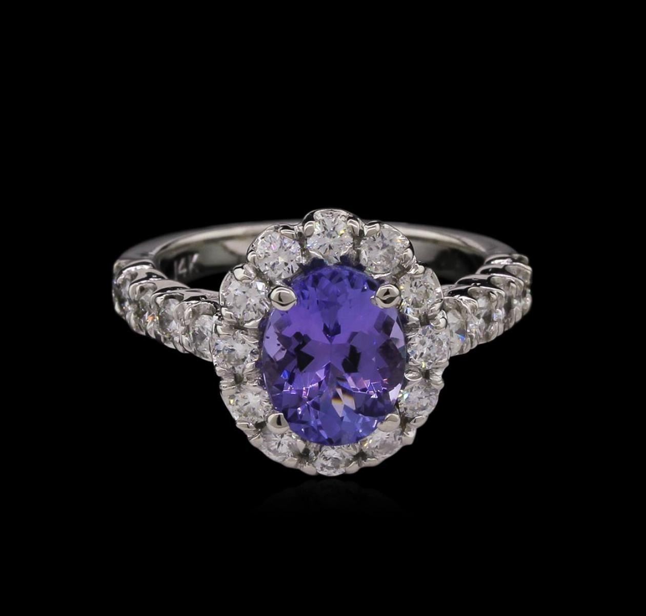 One electronically tested 14KT white gold lady's cast fashion ring with a halo with a bright polish finish. The featured lady's ring has a shank measuring 2.27 millimeters in width. Identified with markings of "14K". Condition is new, good workmanship. Containing: One prong set oval modified brilliant cut natural tanzanite, measuring 9.14 x 7.08 x 5.25mm, approximate weight of 2.48ct., clarity is eye clean, type I, medium light, moderately strong, bluish violet color, (GIA bV 4/4), cut is very good. Transmitting light with no distortion, transparent. Colored gemstones are presumed to have been subjected to commonly used enhancement processes. Graded in the setting. Twenty-Two prong set round brilliant cut diamonds, measuring 2.30 - 2.20 x 1.40mm (depth est.) approximate total weight of 22 Stones = 0.95ct. Graded in the setting. Clarity: SI-1 to I-1 . Color: H - I. Cut Good. Total Weight of Colored Stones 2.48ct.. Total Weight of Diamonds 0.95ct.. Total Weight of Ring 5.30gm at $ 4965.00