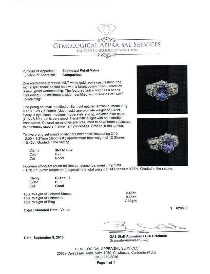 One electronically tested 14KT white gold lady's cast fashion ring with a split shank basket halo with a bright polish finish. The featured lady's ring has a shank measuring 2.23 millimeters wide. Identified with markings of '14K'. Condition is new, good workmanship. Containing: One prong set oval modified brilliant cut natural tanzanite, measuring 9.16 x 7.28 x 5.29mm, (depth est.) approximate weight of 2.48ct., clarity is eye clean, medium, moderately strong, violetish blue color, (GIA vB 5/4), cut is very good. Transmitting light with no distortion, transparent. Colored gemstones are presumed to have been subjected to commonly used enhancement processes. Graded in the setting. Twelve prong set round brilliant cut diamonds, measuring 2.10 - 2.00 x 1.27mm (depth est.) approximate total weight of 12 Stones = 0.40ct. Graded in the setting. Clarity SI-1 to SI-2. Color: H - I Cut Good Fourteen prong set round brilliant cut diamonds, measuring 1.80 - 1.70 x 1.09mm (depth est.) approximate total weight of 14 Stones = 0.28ct. Graded in the setting. Clarity SI-1 to I-1. Color: H - I Cut Good. Total Weight of Colored Stones 2.48ct.. Total Weight of Diamonds 0.68ct.. Total Weight of Ring 7.00gm GAS Appraised.