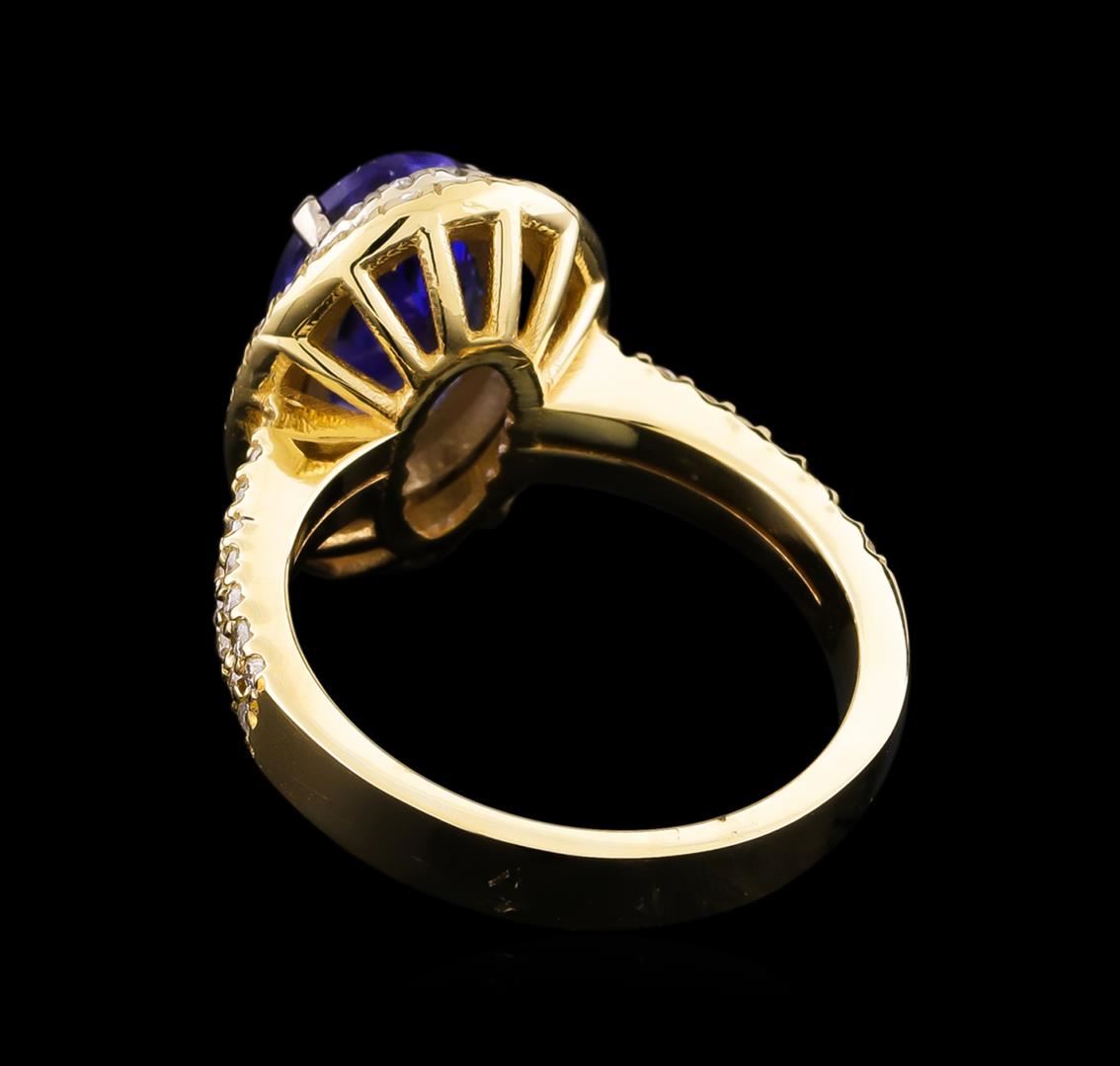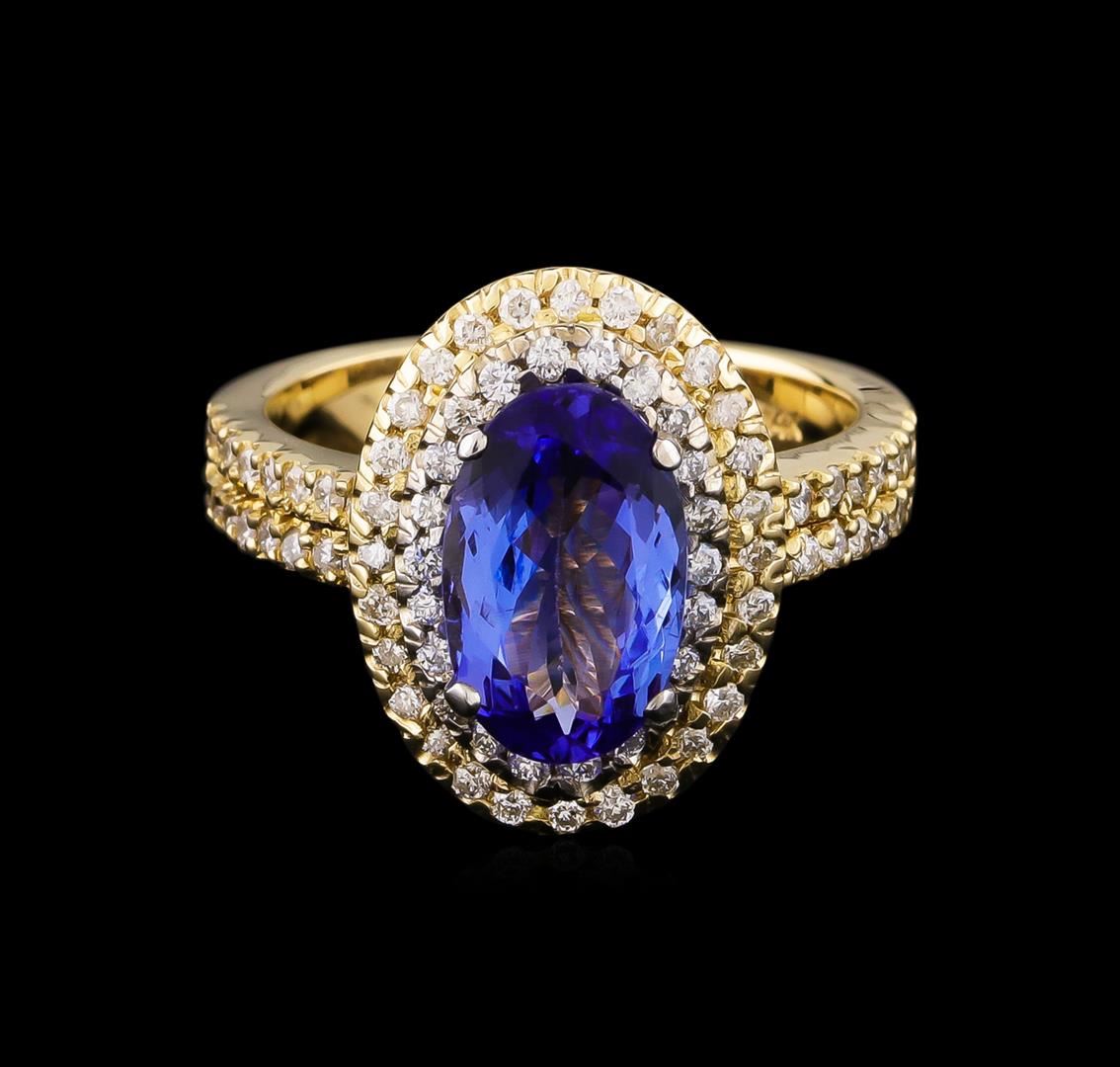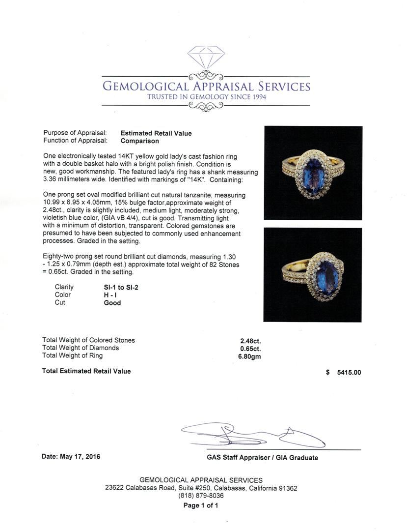 One electronically tested 14KT yellow gold lady's cast fashion ring with a double basket halo with a bright polish finish. The featured lady's ring has a shank measuring 3.36 millimeters wide. Identified with markings of "14K". Condition is new, good workmanship. Containing: One prong set oval modified brilliant cut natural tanzanite, measuring 10.99 x 6.95 x 4.05mm, 15%. bulge factor, approximate weight of 2.48ct., clarity is slightly included, medium light, moderately strong, violetish blue color, (GIA vB 4/4), cut is good. Transmitting light with a minimum of distortion, transparent. Colored gemstones are presumed to have been subjected to commonly used enhancement processes. Graded in the setting. Eighty-Two prong set round brilliant cut diamonds, measuring 1.30 - 1.25 x 0.79mm (depth est.) approximate total weight of 82 Stones = 0.65ct. Graded in the setting. Clarity: SI-1 to SI-2. Color: H - I. Cut Good. Total Weight of Colored Stones 2.48ct. Total Weight of Diamonds 0.65ct. Total Weight of Ring 6.80gm. GAS Appraised at $5,415.00.