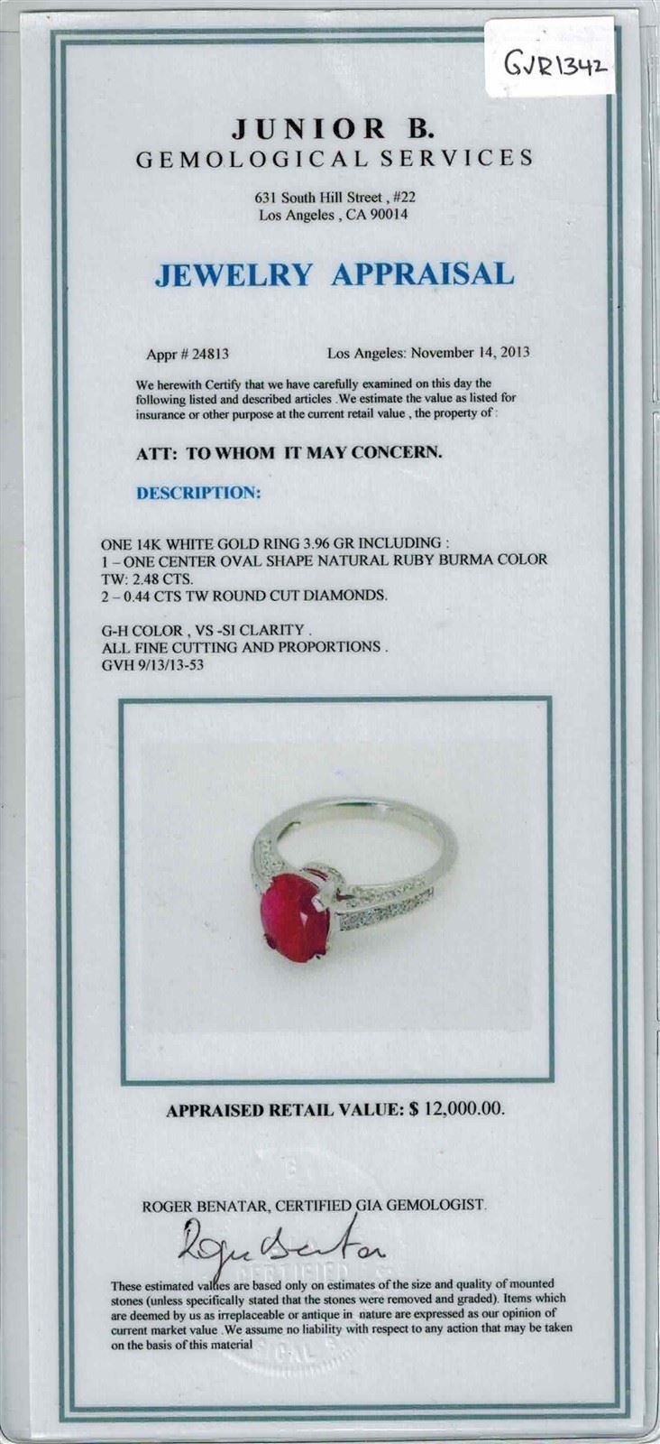 14K W/G NATURAL RUBY RING :3.96GRAM/NATURAL RUBY OVAL :2.48CT/NO LEAD / DIAMOND RD :0.44CT/#GVR1342/ NO LEAD OR GLASS FILLING