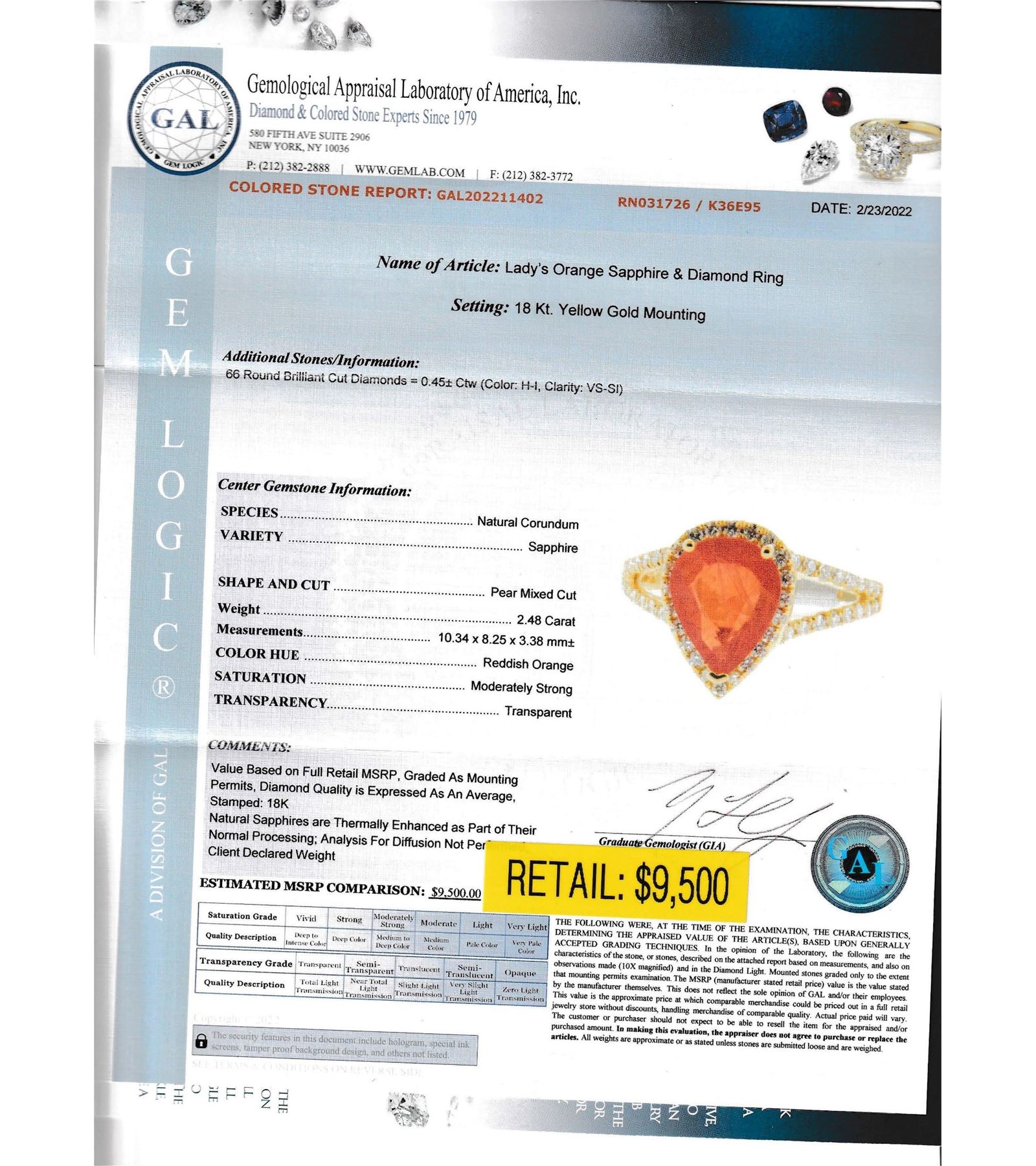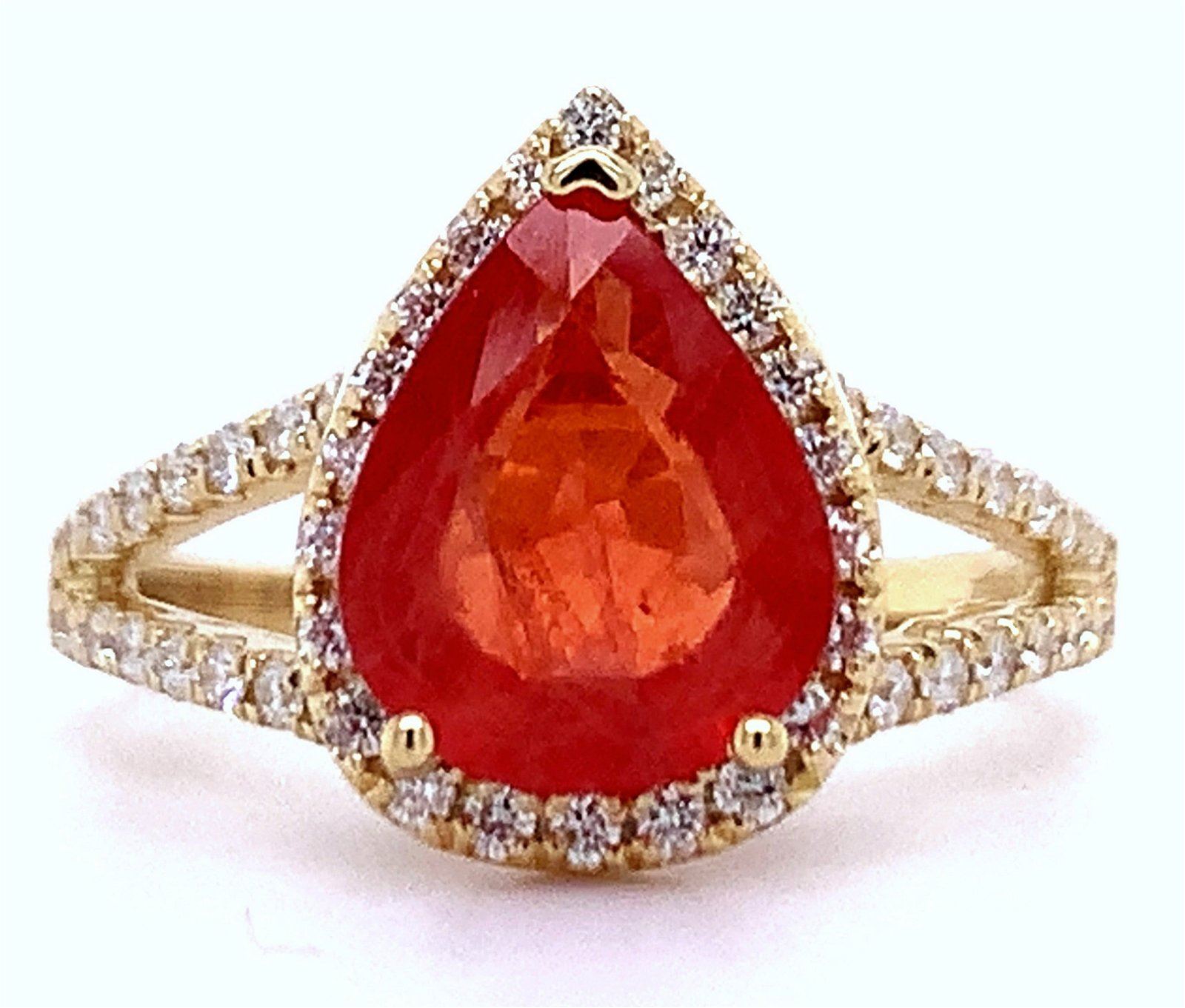 Lady's Orange Sapphire and Diamond Ring Setting: 18 Kt. Yellow Gold Mounting #Additional Stones/Information:# 66 Round Brilliant Cut Diamonds = 0.45+/- Ctw (Color: H-I, Clarity: VS-SI) #Center GemstoneInformation:# SPECIES: Natural Corundum VARIETY: Sapphire SHAPE AND CUT: Pear Mixed Cut Weight: 2.48 Carat Measurements: 10.34 x 8.25 x 3.38mm COLOR HUE: Reddish Orange SATURATION: Moderately Strong TRANSPARENCY:Transparent