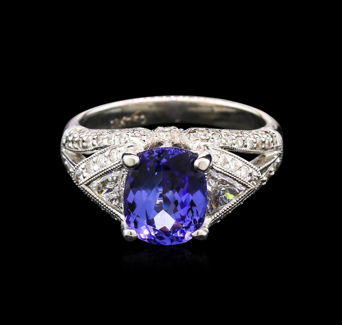 One electronically tested 18KT white gold lady's cast fashion ring with a cathedral shank with a bright polish with milgrain detailing finish. The featured lady's ring has a shank measuring 2.70 millimeters wide. Identified with markings of "18K 750". Condition is new, good workmanship. Containing: One prong set rectangular cushion modified brilliant cut natural tanzanite, measuring 9.06 x 7.34 x 4.37mm, 10% bulge factor, approximate weight of 2.49ct., clarity is eye clean, type I, medium, very slightly grayish, bluish violet color, (GIA bV 5/3), cut is good. Transmitting light with no distortion, transparent. Colored gemstones are presumed to have been subjected to commonly used enhancement processes. Graded in the setting. Two bezel set triangle brilliant cut diamonds, measuring 4.20 x 4.00 x 2.48mm (depth est.) approximate total weight of 2 Stones = 0.48ct. Graded in the setting. Clarity: SI-1 to SI-2. Color: G - Good Fourteen prong set round brilliant cut diamonds, measuring 1.30 - 1.25 x 0.83mm (depth est.) approximate total weight of 14 Stones = 0.12ct. Graded in the setting. Clarity: SI-1 to SI-2. Color: G - Good Seventy prong set round brilliant cut diamonds, measuring 1.20 - 1.10 x 0.75mm (depth est.) approximate total weight of 70 Stones = 0.42ct. Graded in the setting. Clarity: SI-1 to SI-2. Color: G - I. Cut Good. Total Weight of Colored Stones 2.49ct. Total Weight of Diamonds 1.02ct. Total Weight of Ring 6.80gm. GAS Appraised at $7,355.00.