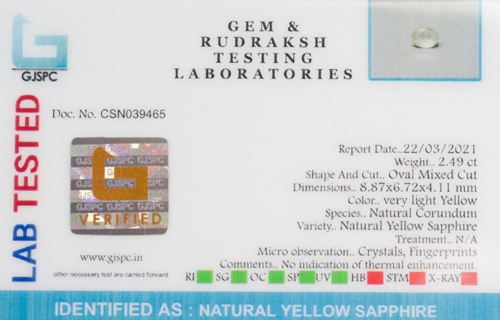 One (1) 2.49 ct oval cut very light yellow natural sapphire. Accompanied with GJSPC certificate. 8.87 x 6.72 x 4.11 mm.