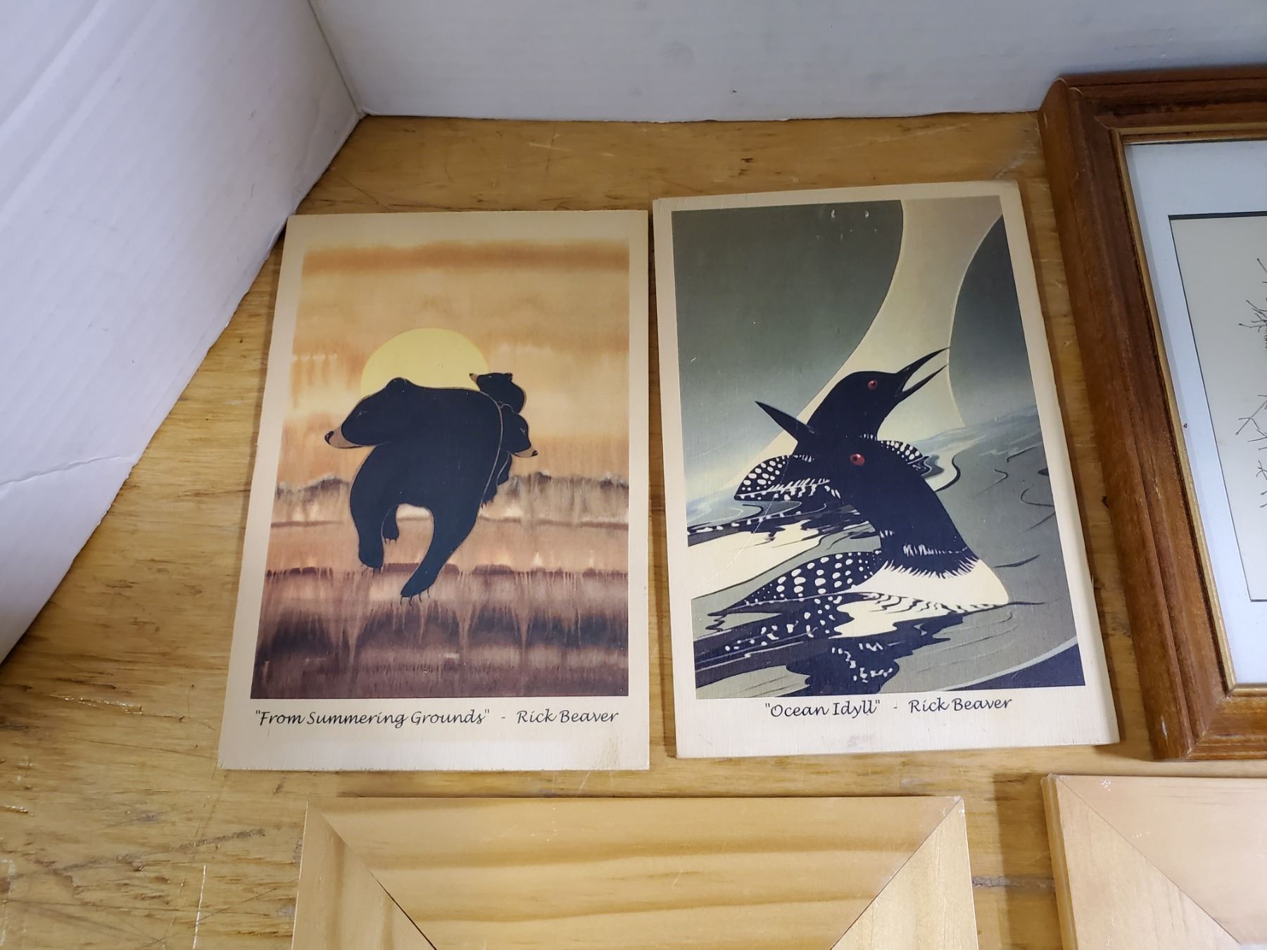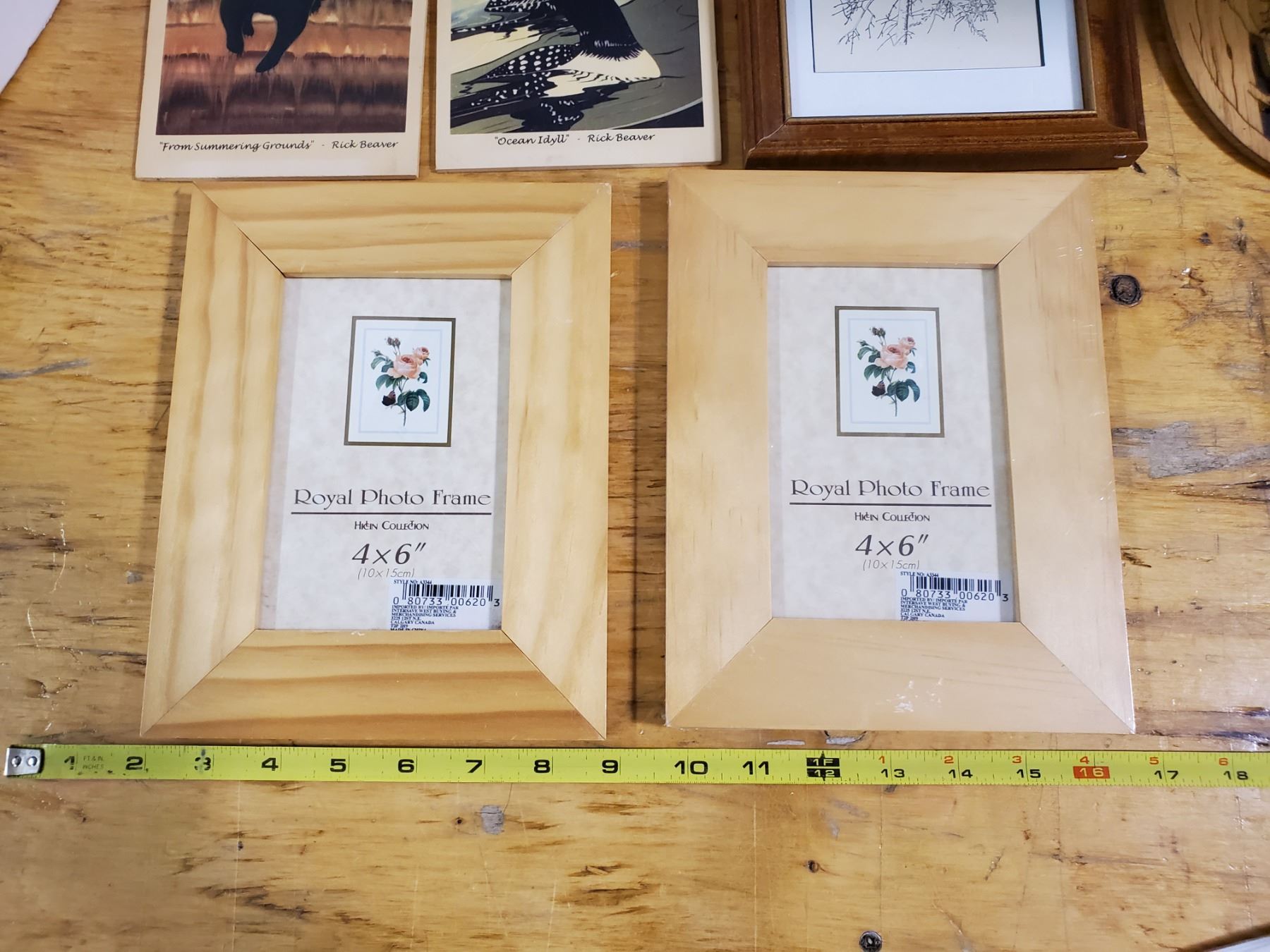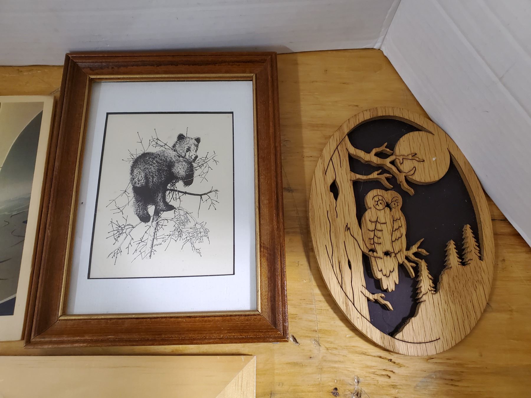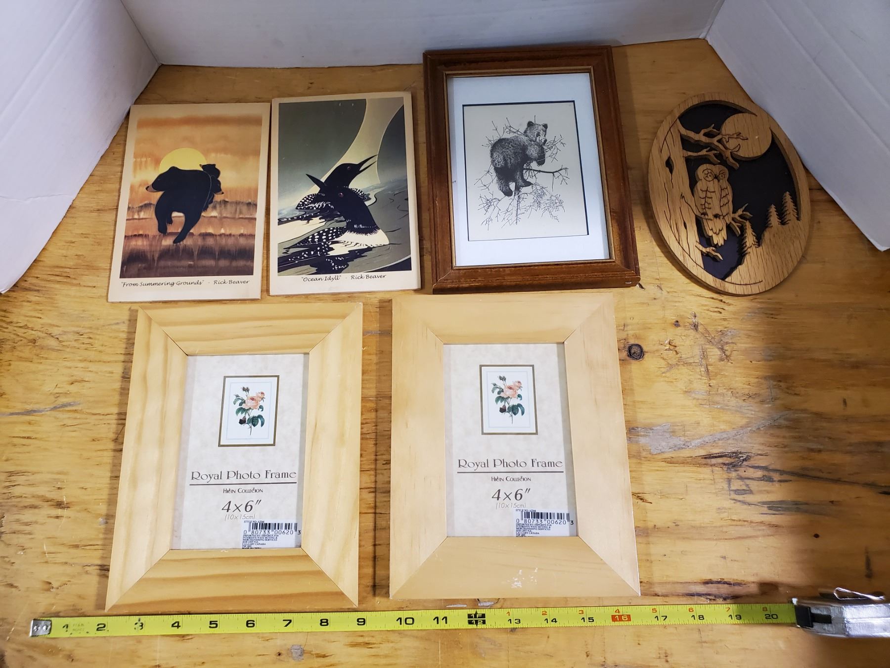 2 4X6" FRAMES, 2 RICK BEAVER PRINTS, SCROLL SAW OWL