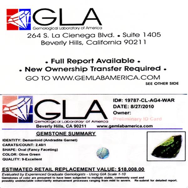 Excellent olive green colored specimen oval cut; lab quality evaluation 9; treatment as noted; Gem Guide wholesale $3000-$4200; full retail appraisal $18008; full lab evaluation available