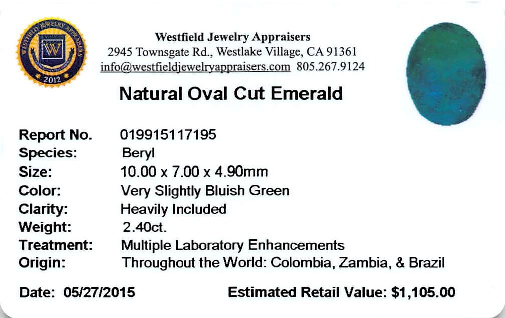 One oval mixed cut natural emerald, measuring 10.00 x 7.00 x 4.90mm, exact weight 2.40ct., clarity is heavily included, type III, medium dark, very slightly grayish, very slightly bluish green color, (GIA vslbG 6/3), cut is good. Transmitting light somewhat diffusely, translucent, Naturally occurring internal & external characteristics are present, Indications of multiple laboratory enhancements, including high temperature heat treatment. Westfield Appraised at $1,105.00.