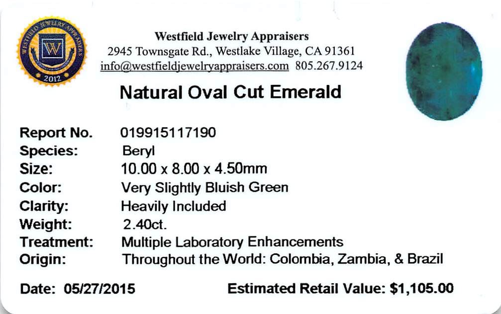 One oval mixed cut natural emerald, measuring 10.00 x 8.00 x 4.50mm, exact weight 2.40ct., clarity is heavily included, type III, medium dark, very slightly grayish, very slightly bluish green color, (GIA vslbG 6/3), cut is good. Transmitting light somewhat diffusely, translucent, Naturally occurring internal & external characteristics are present, Indications of multiple laboratory enhancements, including high temperature heat treatment. Westfield Appraised at $1,105.00.