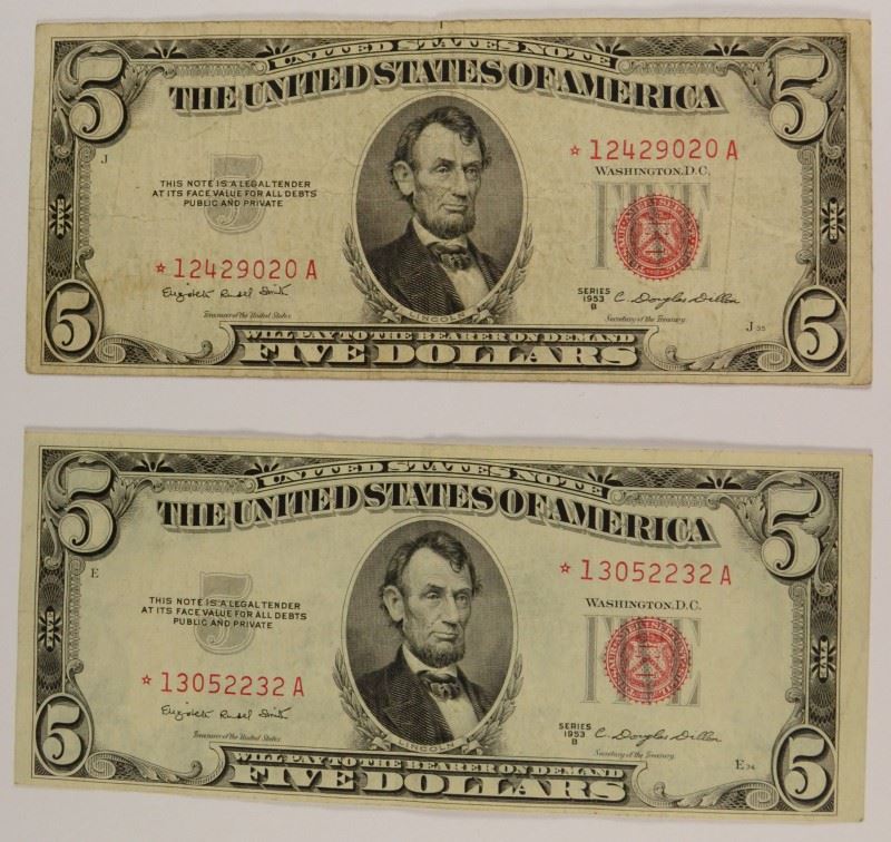 2- $5.00 STAR NOTES RED SEAL, BOTH 1953B, CIRC & AU