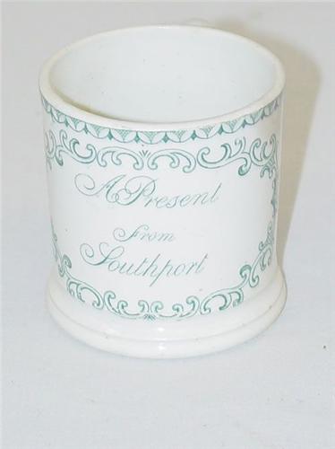 2 5/8" STAFFORDSHIRE GREEN TRANSFER CHILDS MUG-"A PRESENT FROM SOUTHPORT" - SMALL STAIN & SMALL TOP RIM INTERIOR CHIP