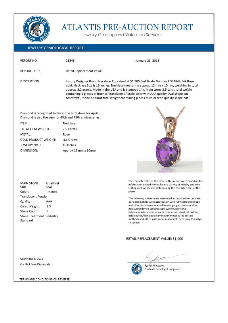 REF-28Y9K -21848 ---- 2.5 CTW Amethyst Designer Inspired Solitaire Necklace 14K Rose Gold ---- Luxury Designer Brand Necklace Appraised at $1,900 Certificate Number US21848 14k Rose gold, Necklace Size is 16 Inches, Necklace measuring approx. 12 mm x 10mm, weighing in total approx. 3.2 grams. Made in the USA and is stamped 14k, Main stone 2.5 carat total weight containing 1 pieces of Intense Translucent Purple color with AAA quality Oval shape cut Amethyst , Stone #2 carat total weight containing pieces of color with quality shape cut