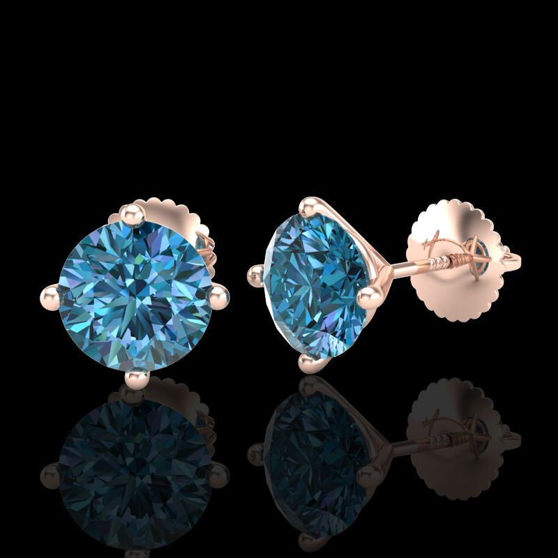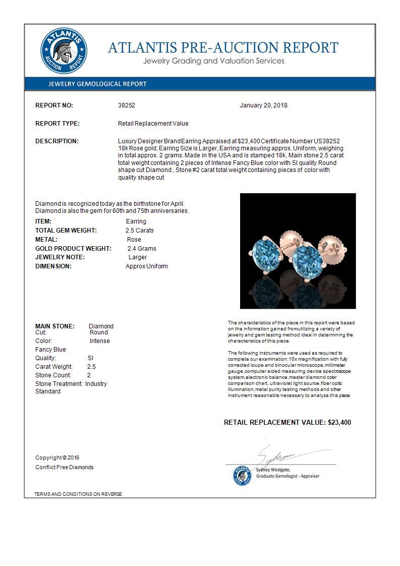 REF-354K5W -38252 ---- 2.5 CTW Fancy Intense Blue Diamond Art Deco Stud Earrings 18K Rose Gold ---- Luxury Designer Brand Earring Appraised at $23,400 Certificate Number US38252 18k Rose gold, Earring Size is Larger, Earring measuring approx. Uniform, weighing in total approx. 2 grams. Made in the USA and is stamped 18k, Main stone 2.5 carat total weight containing 2 pieces of Intense Fancy Blue color with SI quality Round shape cut Diamond , Stone #2 carat total weight containing pieces of color with quality shape cut