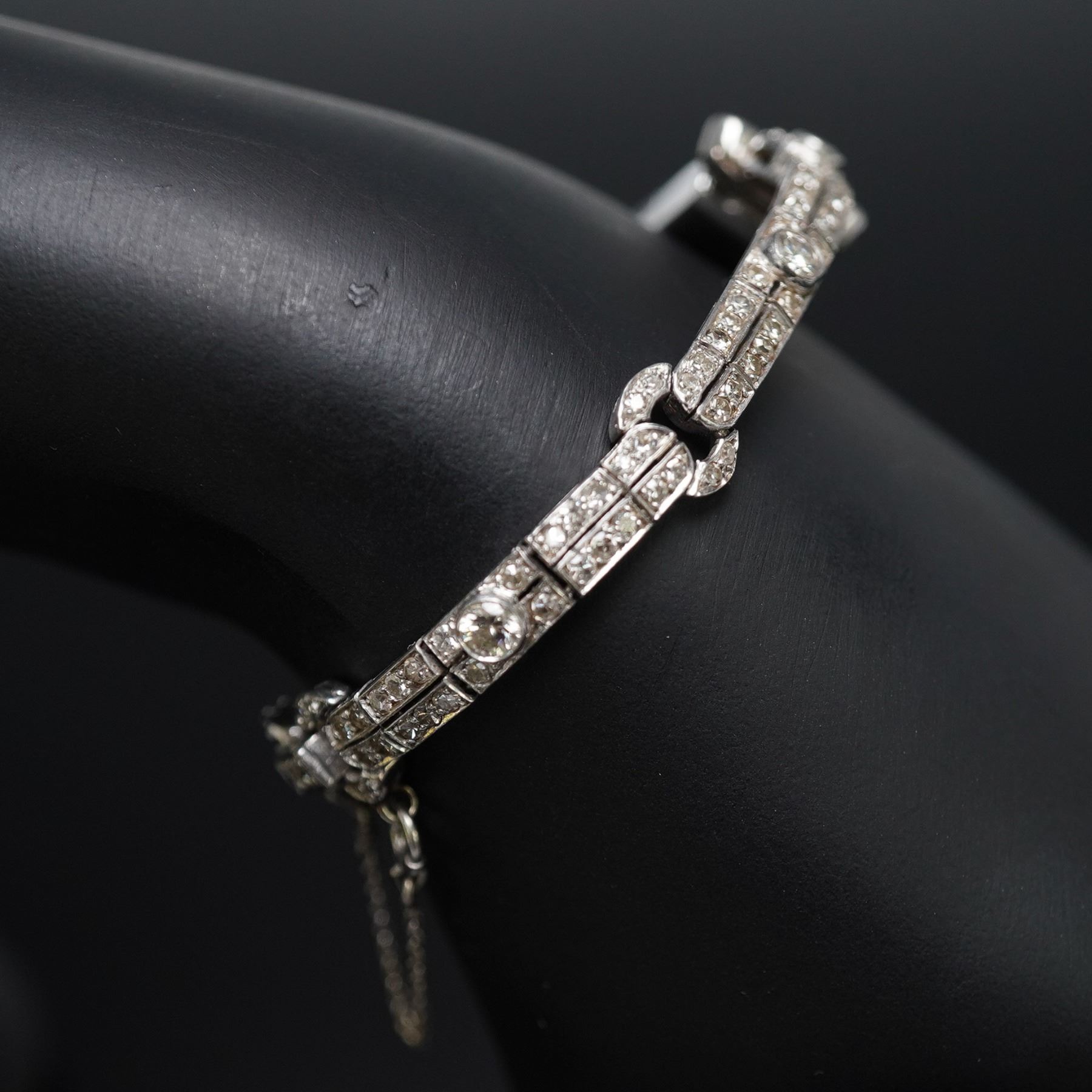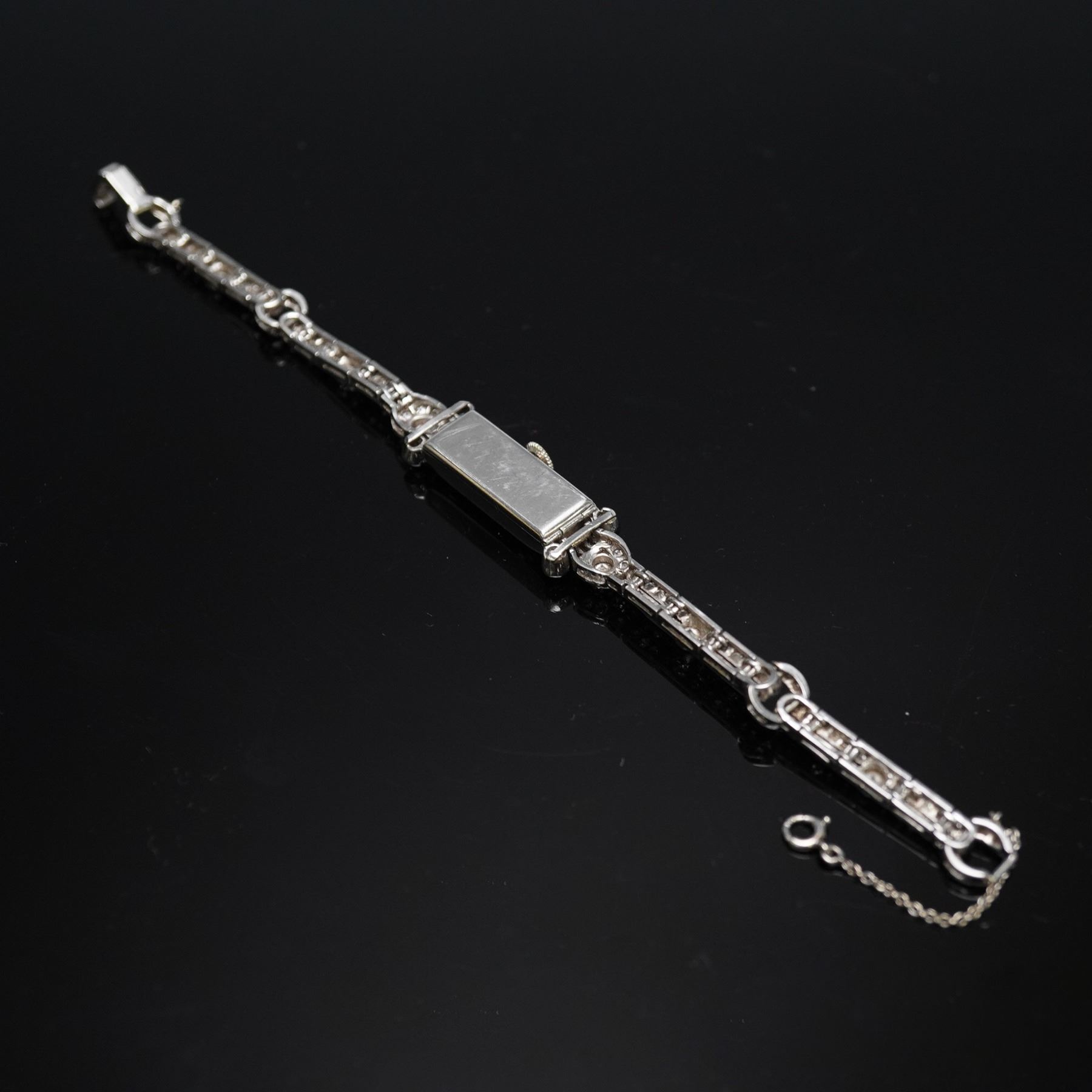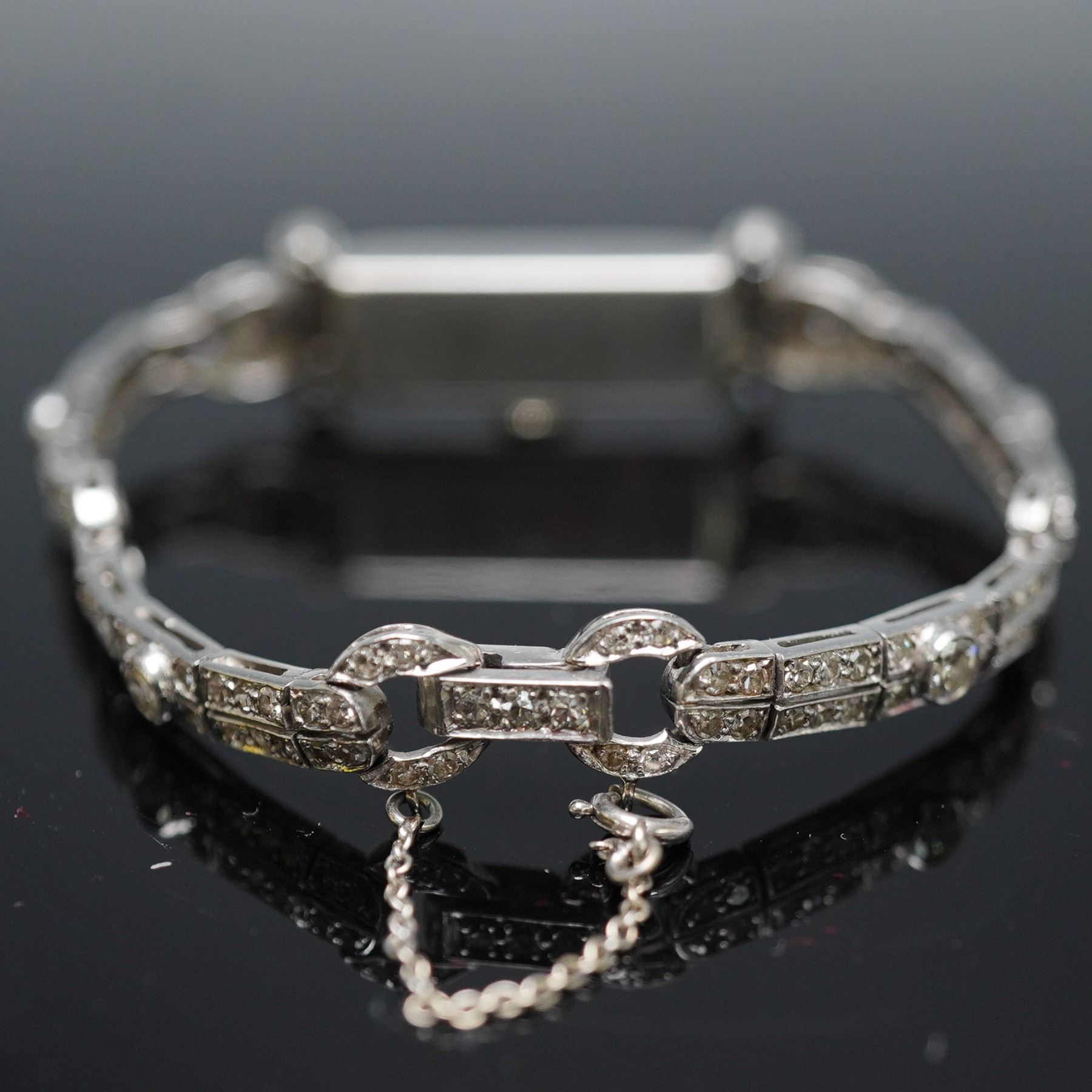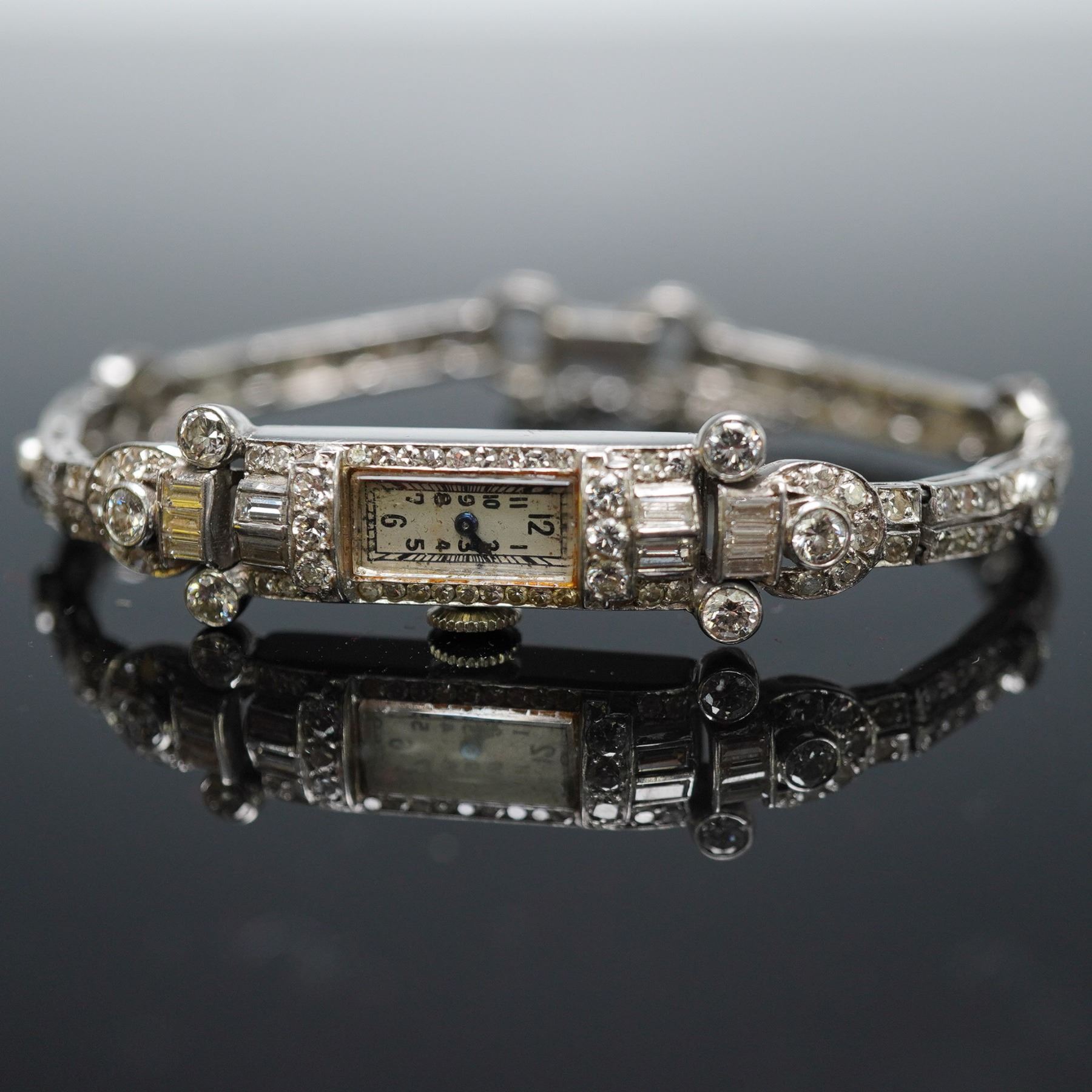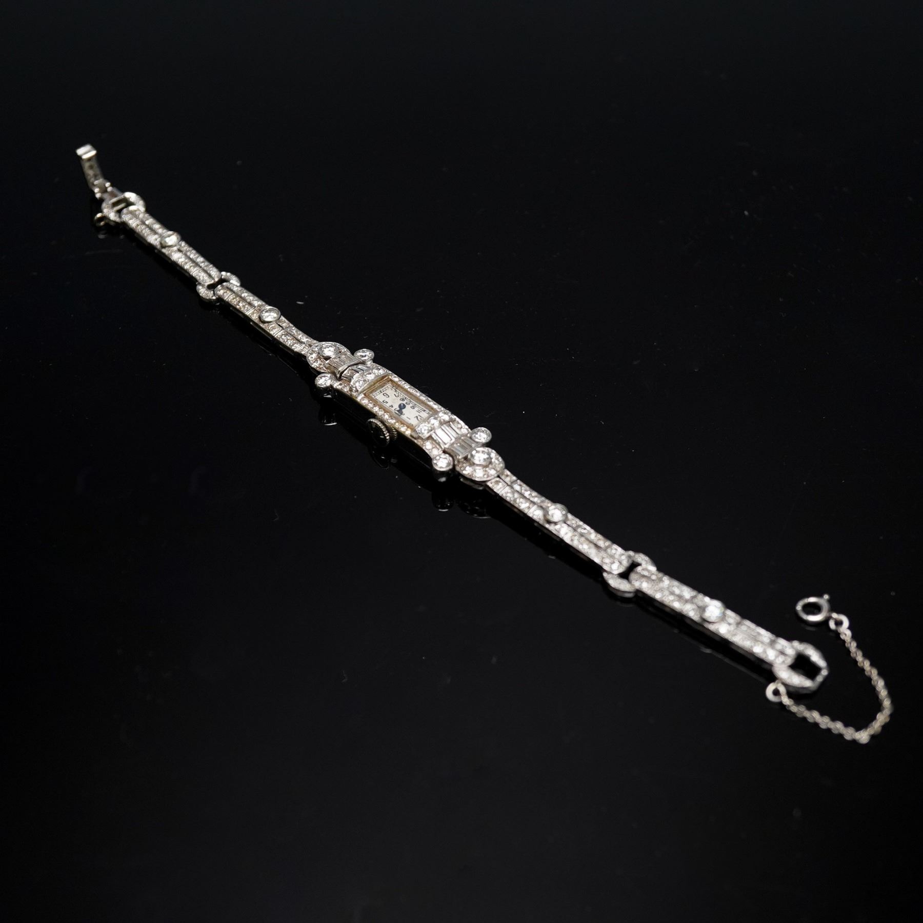 Refined vintage Gruen wristwatch featuring a Swiss 3094 movement with 17 jewels, crafted in Geneva. Composed of 900 platinum with 100 iridium alloy and 14K white gold, the piece showcases the use of premium materials typical of the Art Deco period. The watch is adorned with approximately 2.5 carats total weight of diamonds in both round and baguette cuts, with stones graded H color and VH1 clarity. Fitted with a safety chain and spring ring clasp, this timepiece blends fine Swiss horology with sophisticated vintage jewelry design. Approx. weight: 16g.