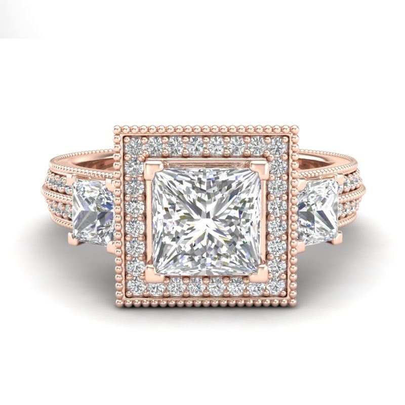 37197 - REF-527H3M ---- 2.5 CTW Princess VS/SI Diamond Micro Pave 3 Stone Ring 18K Rose Gold ---- Luxury Designer Brand 3 stone ring Appraised at $26,100 Certificate Number US37197 18k Rose gold, 3 stone ring Size is 7, 3 stone ring measuring approx. Uniform, weighing in total approx. 7 grams. Made in the USA and is stamped 18k, Main stone 1.06 carat total weight containing 1 pieces of H-J color with VS/SI quality Princess shape cut Diamond , Stone #2 0.59 carat total weight containing 2 pieces of H-I color with VS/SI quality Princess shape cut Diamond , Stone #3 0.85 carat total weight containing 104 pieces of G-H color with VS/SI quality Round shape cut Diamond