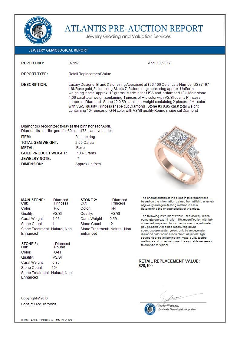 2.5 CTW Princess VS/SI Diamond Micro Pave 3 Stone Ring 18K Rose Gold ---- Luxury Designer Brand 3 stone ring Appraised Retail Price at $26,100 ---- SKU Number US37197 18k Rose gold 3 stone ring Size is 7, 3 stone ring measuring approx. Uniform, weighing in total approx. 10 grams. Made in the USA and is stamped 18k, Main stone 1.06 carat total weight containing 1 pieces of H-J color with VS/SI quality Princess shape cut Diamond , Stone #2 0.59 carat total weight containing 2 pieces of H-I color with VS/SI quality Princess shape cut