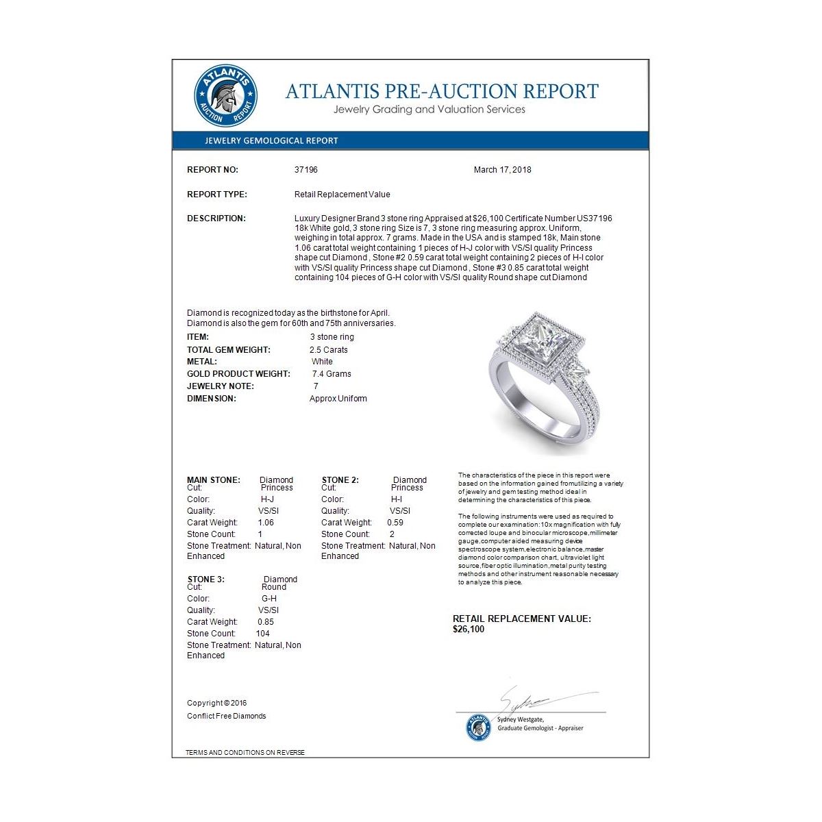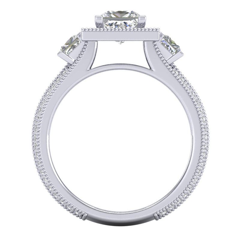 REF-527M3H -37196 ---- 2.5 CTW Princess VS/SI Diamond Micro Pave 3 Stone Ring 18K White Gold ---- Luxury Designer Brand 3 stone ring Appraised at $26,100 Certificate Number US37196 18k White gold, 3 stone ring Size is 7, 3 stone ring measuring approx. Uniform, weighing in total approx. 7 grams. Made in the USA and is stamped 18k, Main stone 1.06 carat total weight containing 1 pieces of H-J color with VS/SI quality Princess shape cut Diamond , Stone #2 0.59 carat total weight containing 2 pieces of H-I color with VS/SI quality Princess shape cut Diamond , Stone #3 0.85 carat total weight containing 104 pieces of G-H color with VS/SI quality Round shape cut Diamond