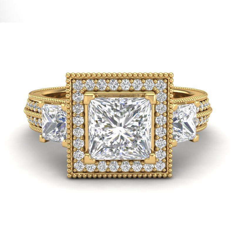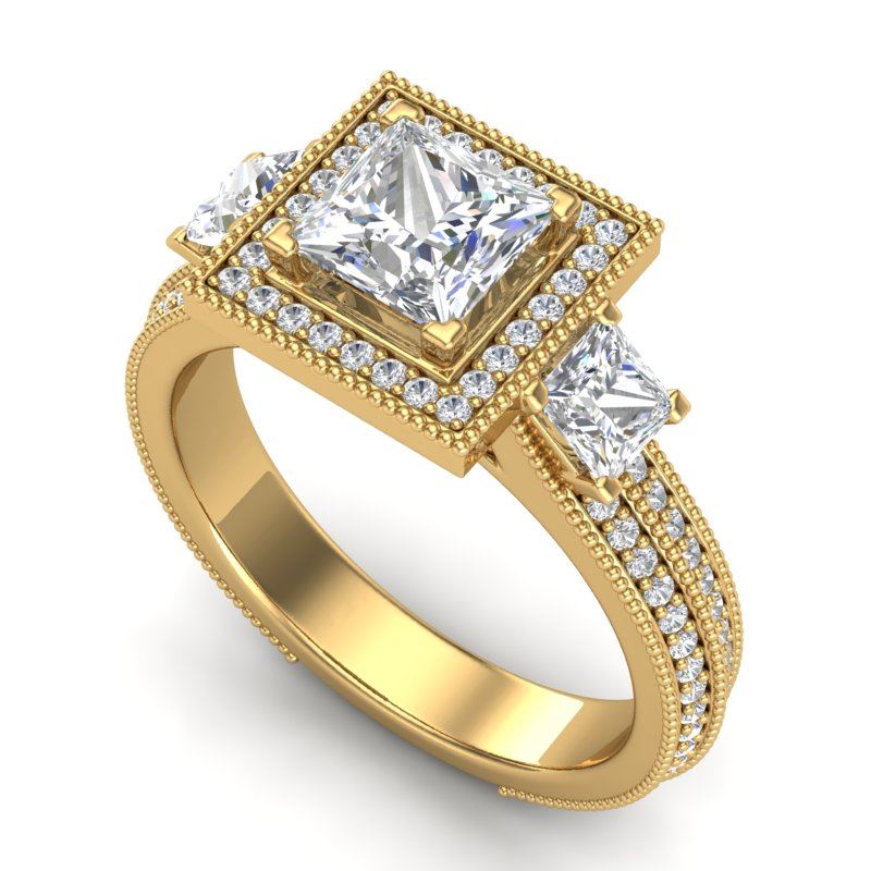 2.5 CTW Princess VS/SI Diamond Micro Pave 3 Stone Ring 18K Yellow Gold ---- Luxury Designer Brand 3 stone ring Appraised Retail Price at $26,100 ---- SKU Number US37198 18k Yellow gold 3 stone ring Size is 7, 3 stone ring measuring approx. Uniform, weighing in total approx. 10 grams. Made in the USA and is stamped 18k, Main stone 1.06 carat total weight containing 1 pieces of H-J color with VS/SI quality Princess shape cut Diamond , Stone #2 0.59 carat total weight containing 2 pieces of H-I color with VS/SI quality Princess shape cut