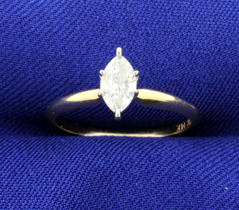 The diamond weighs 0.40 carats and is marquise shaped. Clarity SI2, color H. Size 7. 1.9g